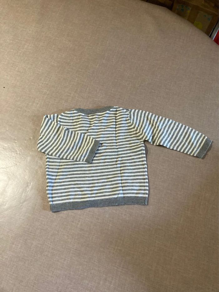 Adorable petit pull gris et blanc rayé de la marque TEX, en 100 % coton. Boutonnage sur le devant pour faciliter l’enfilage, petit col rond. Taille 9 mois. Doux, confortable et facile à assortir. État : Très bon état général ⸻ #pullbébé #pull9mois #texbaby #vêtementsbébé #bébégarçon #basique #modebébé #vêtementbébéoccasion