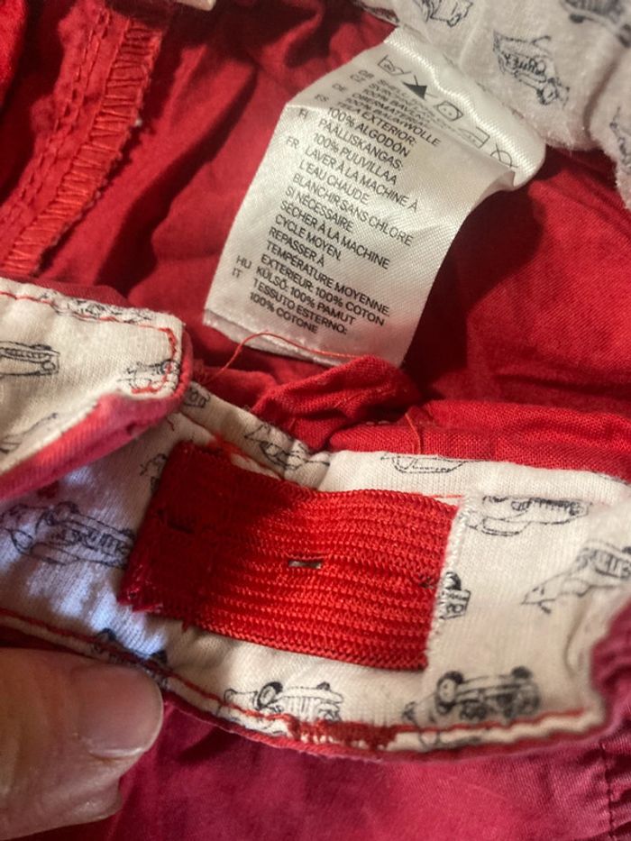 Pantalon rouge H&M pour bébé garçon, taille 18-24 mois (86 cm). • 100 % coton, matière douce et confortable • Intérieur ceinture doublé tissu blanc imprimé petites voitures • Taille ajustable grâce à un élastique boutonnière • Fermeture par bouton pression • Bon état général, quelques froissures liées au stockage Idéal pour un petit look chic et décontracté ! #pantalonbébé #hm #vêtementsbébé #bébé9mois #bébé18mois #bébégarçon #cottonbébé #lookbébé #secondeMainBébé