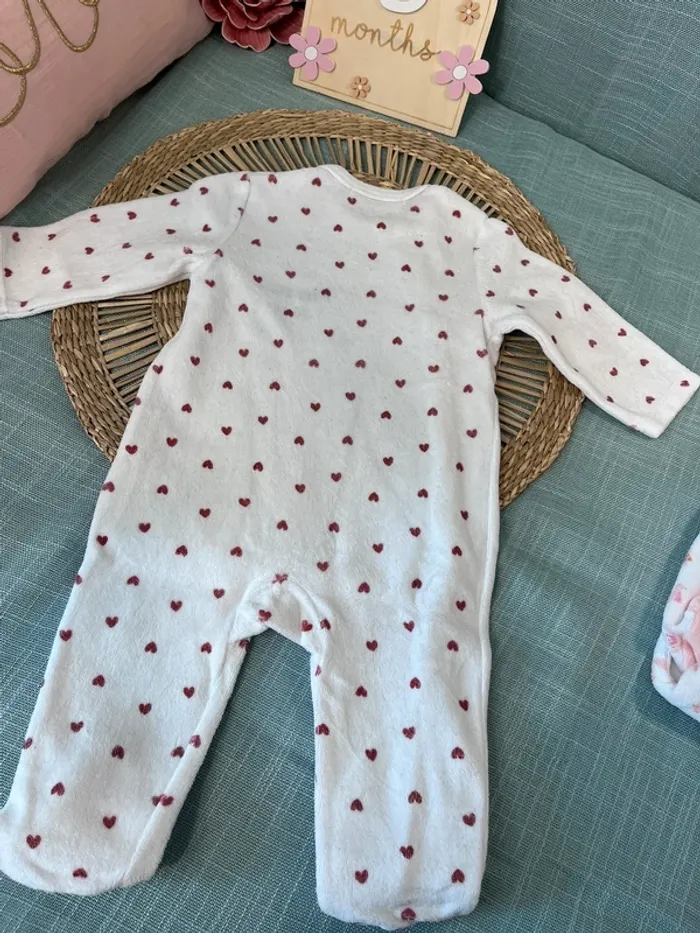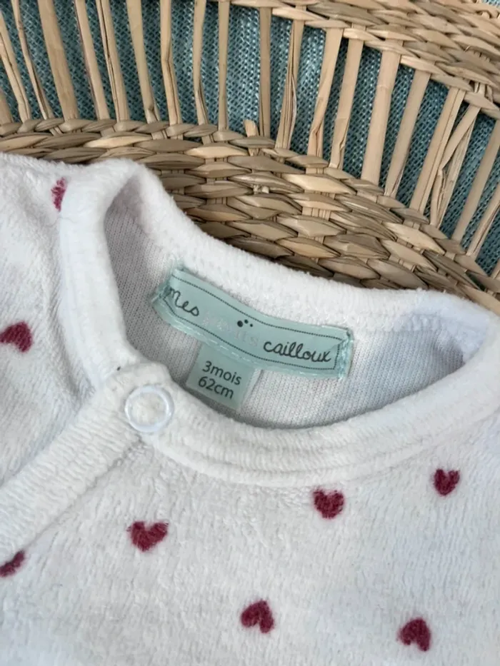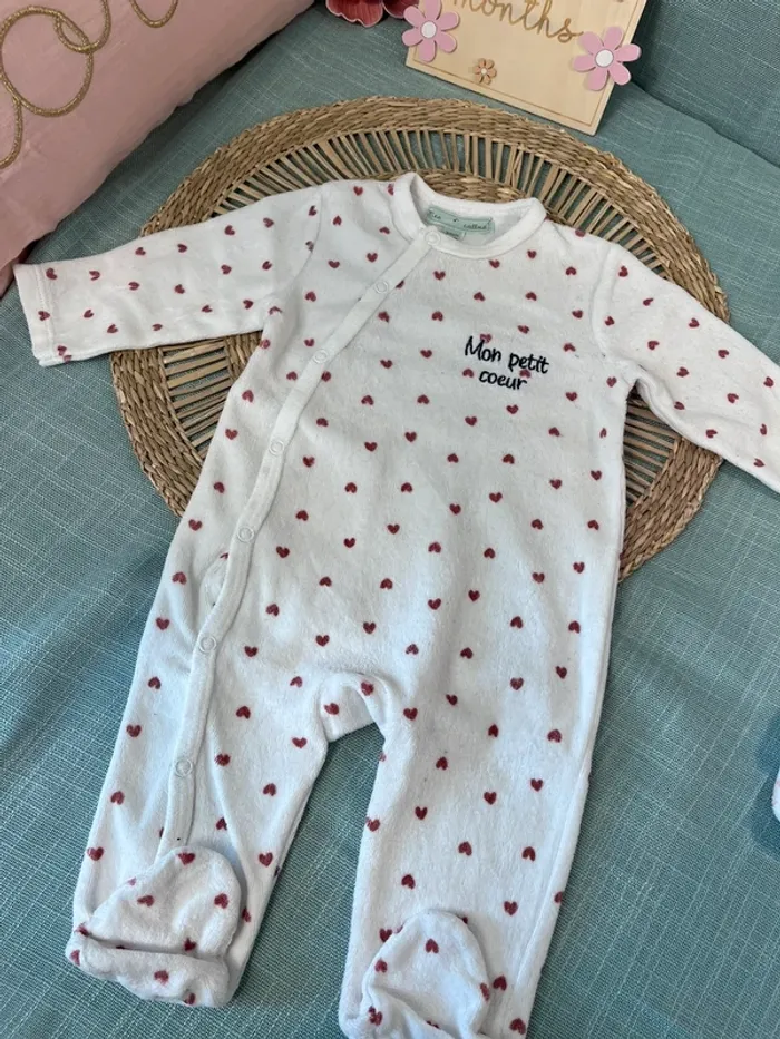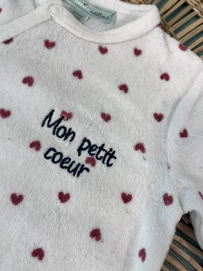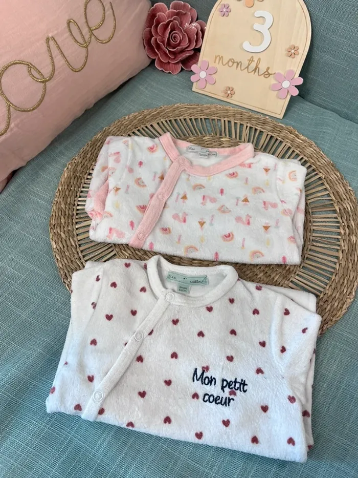 Lot 2 Pyjamas velours taille 3 mois Marque petits cailloux En très bon état attention un légère tache bleu sur celui avec les cœur voir photo Cliquer sur #tclamat3m pour l’ensemble des annonces de cette taille #coeur #ouverturedevant #velours