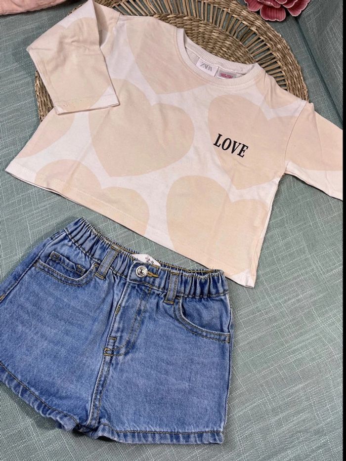 Ensemble taille 9-12 mois 80 cm Marque Zara Comprends un haut manche longue et un short en jean En très bon état attention un point de tache sur une manche du haut Cliquer sur #tclamat18m pour l’ensemble des annonces de cette taille Et sur #tczara pour l’ensemble des articles de cette marque #zara #coeur #beigemom