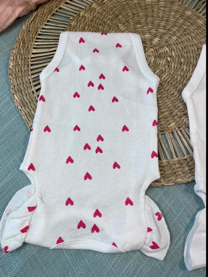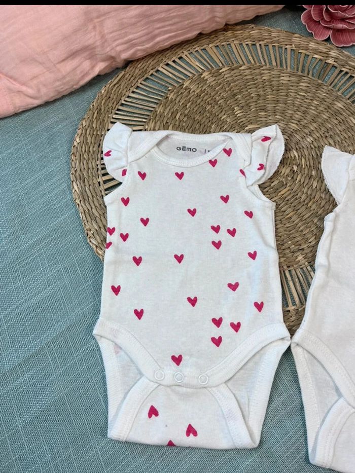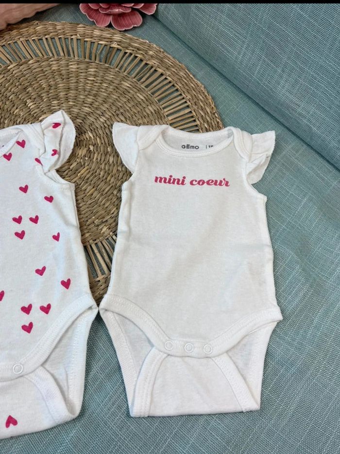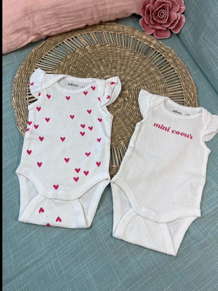 Lot 2 bodies taille 1 mois Marque gemo En très bon état aucun défaut Lot de 3 brassières naissance et un bandeau en maille 1 sans marque et 2 MLT