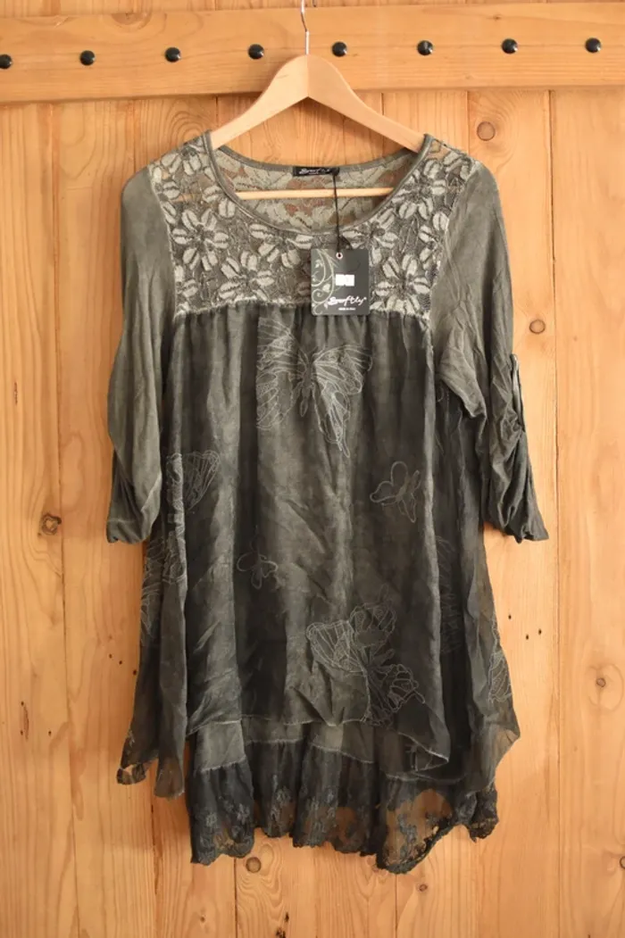 😍 PROMOTIONS : 4.90€ PIECE pour 80% de la Boutique - DU 24/06/25 AU 22/07/25 (après ce délai, le tarif reviendra à la normale - tarif non négociable) ❤️ 👗DEPOT VENTE - énormément de choix, toutes les tailles et tous les styles !👜 Blouse Softly (ou robe) - Made in Italy en taille TU - neuve avec étiquettes🌟 🌟Couleur : gris 🌟Motif : large, papillon, dentelle, effet vintage 🌟Matières : viscose, élasthanne, soie 💶 Remise sur les lots : 🌸 5%dès 2 articles 🌸 10% dès 3 articles 🌸 15% dès 5 articles 💌 Envoi rapide et soigné (tout emballage est recyclé) 🚶🏻‍➡️ Remise en main propre possible dans les alentours d'Angers