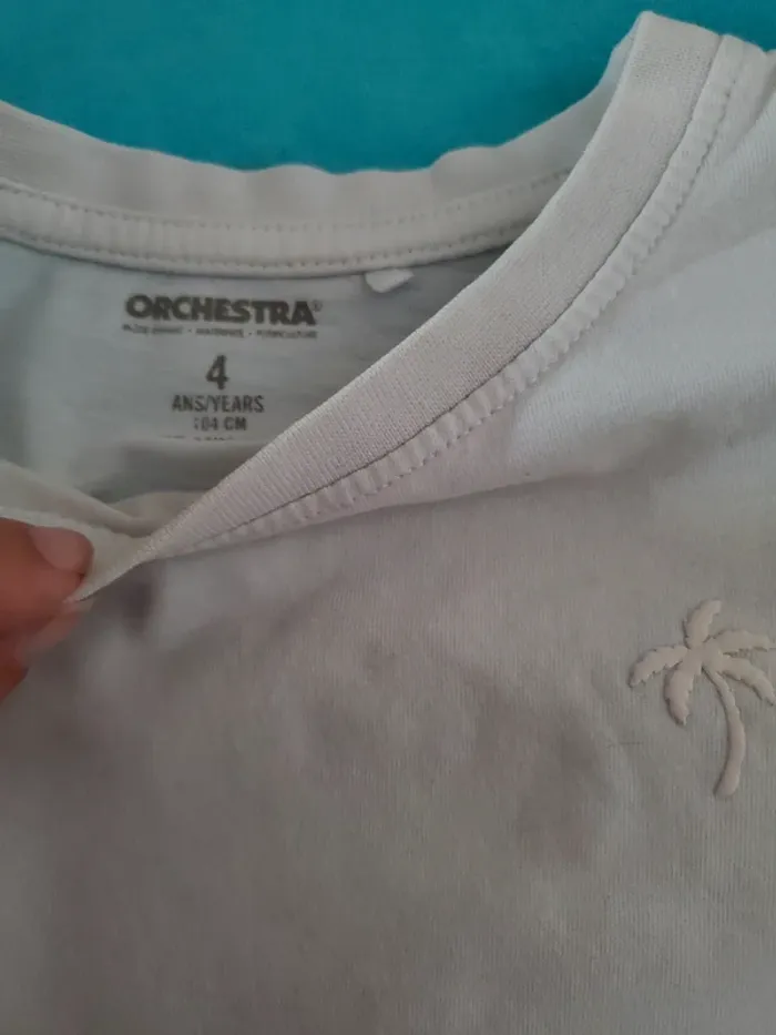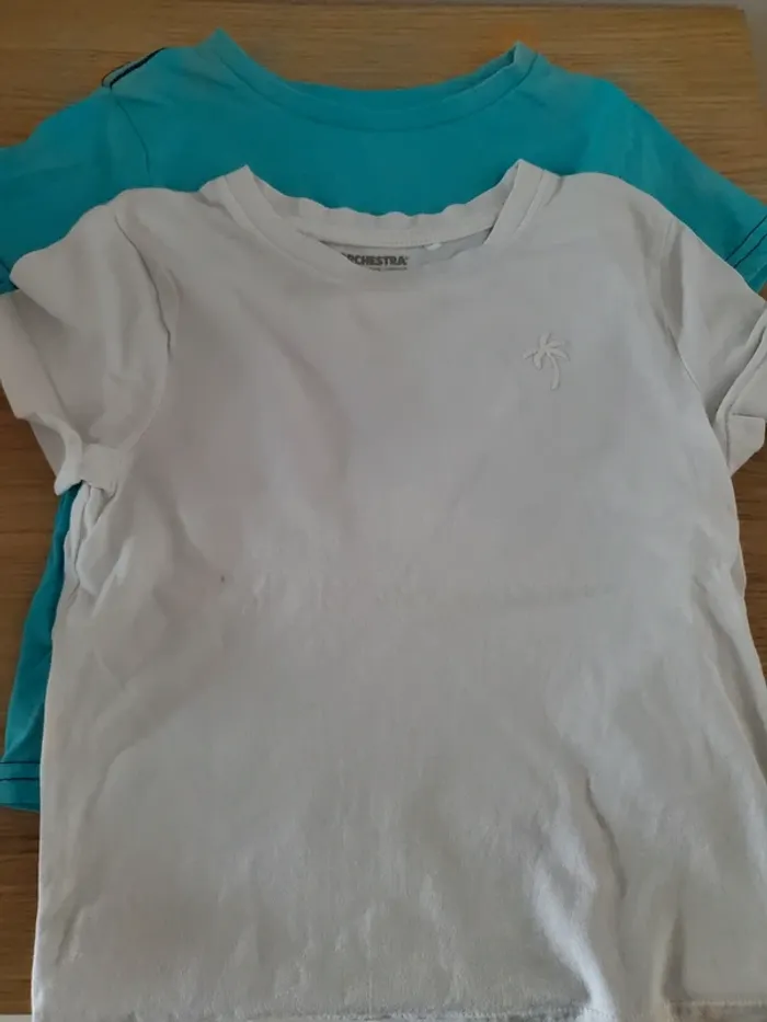 Lot de 2 t shirts de couleur unie en taille 4 ans. Le blanc est de marque Orchestra et a un petit palmier blanc en motif devant. Le bleu est de marque U.