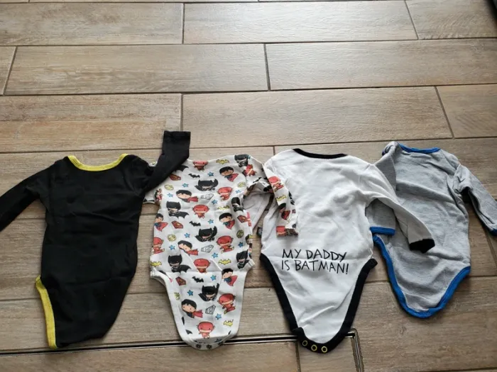 Lot de 4 bodies manches longues super héros. Très bon état. A signaler un petit trou dans le bodie batman blanc (voir photo). Taille 6 mois. Batman, Superman, Flash