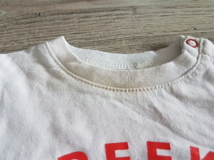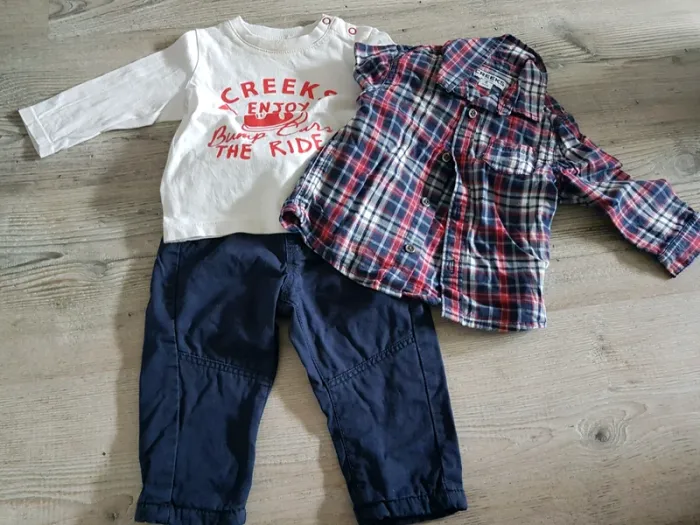 Ensemble 6 mois composé d'un pantalon, d'un t shirt manches longues et d'une chemise à carreaux. Je ne compte pas le t shirt dans le prix du lot car il est taché au col (voir photo). Le reste est en très bon état.