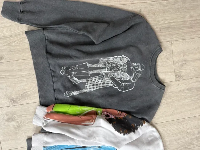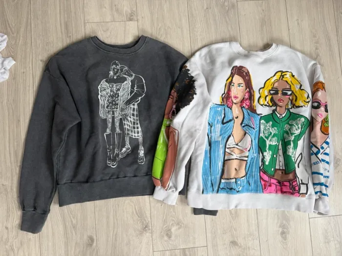 Lot pull taille s mais loose vas pour un m également Défaut sur le pull Zara je pense a l’impression la couleur a été à coter du dessin( acheté comme cela) ne gêne en rien sa se fond dans le dessin une fois porté