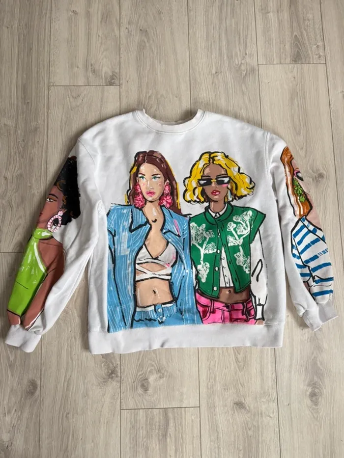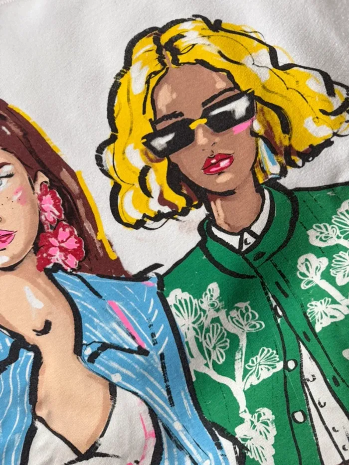 Pull Zara taille s (loose) peut aller à un m également Je pense qu’il a un défaut mais je ne suis pas sûr à coter du coup de la femme il y a la couleur du dessin mais je ne sais pas si c’est fais exprès je l’ai acheté comme cela mais pour moi sa semble être un défaut lors de l’impression ne gêne en rien une fois porté on y fait même pas attention