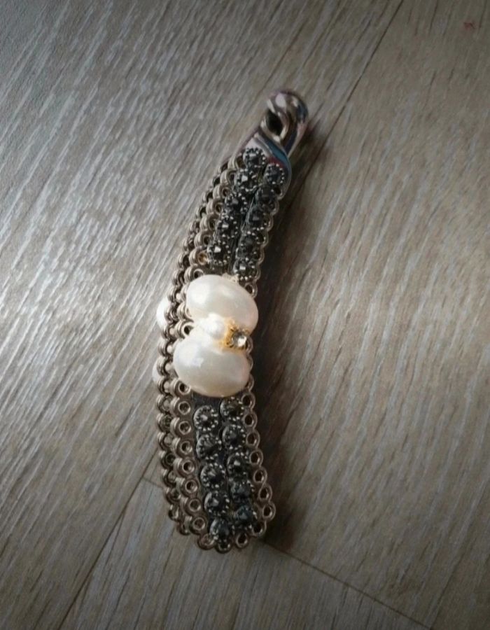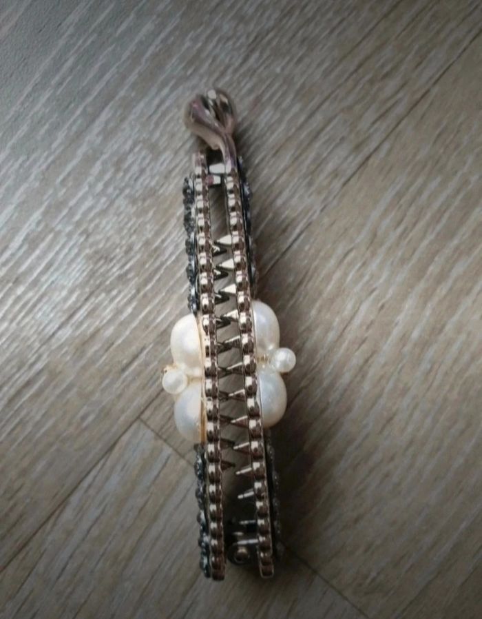 Je vends cette pince à cheveux ornée de perles et de strass. - Type de produit : Accessoire pour cheveux - Univers : Femme - Matière : Plastique - Couleur : Gris / Anthracite - Détails : Perles et strass décoratifs État : Neuf sans étiquette N'hésitez pas à me contacter pour plus d'informations !