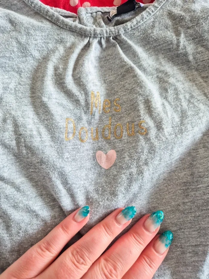 2 t shirt manches longues 12 mois - rouge à pois bout chou - gris écriture "mes doudous" kiabi Pour tous mes articles en 12 mois : #lylaraya12mois