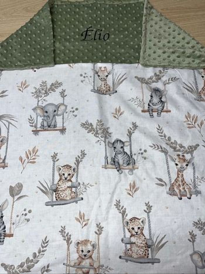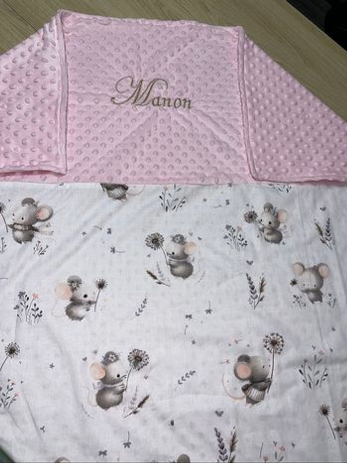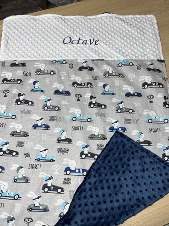 Plaid avec prénom brodé Tissu imprimé et tissu tout sous mincky Taille environ 70x100 cm Possible de le faire en version couverture chaude avec ouatine plus 5 euro