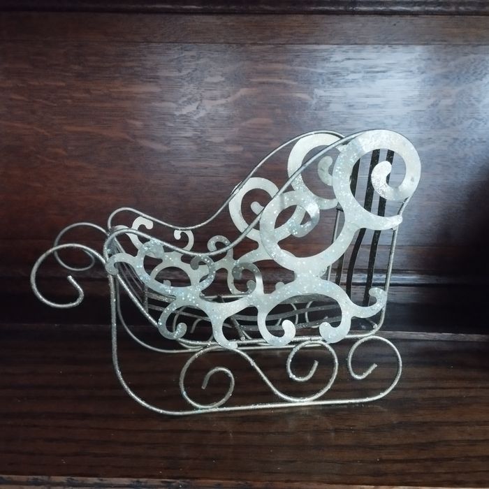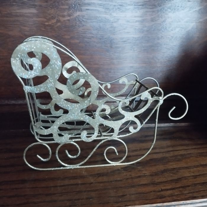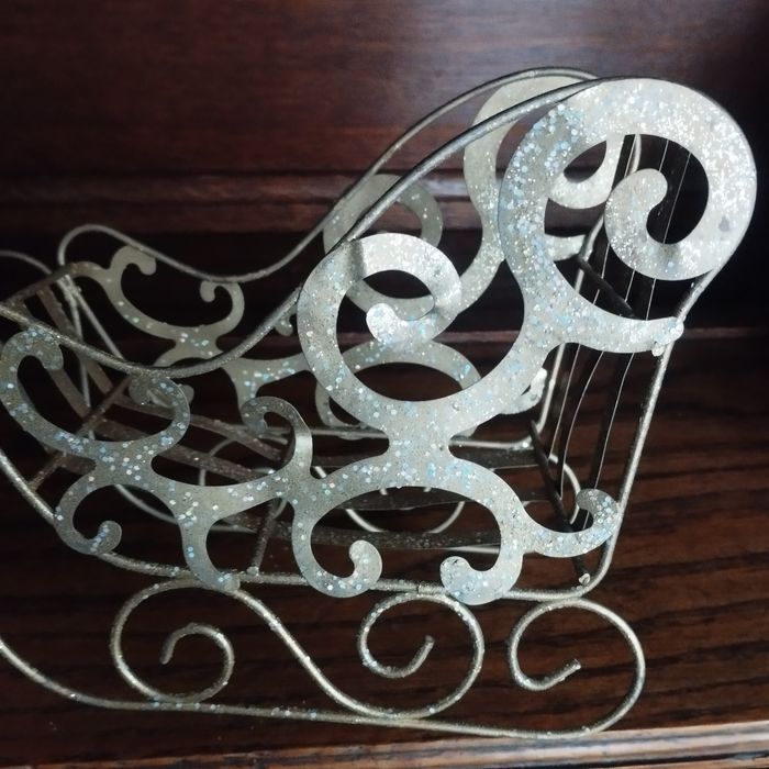 Décoration Un traineau de Noël en fin métal doré et pailleté, A vous de le remplir si vous le voulez , par des boules ou guirlandes, ou par des gourmandises , chocolat, une petite plante ! Longueur 18cm Hauteur 14.5cm Profondeur 7.5cm. Son poids 116Grs.