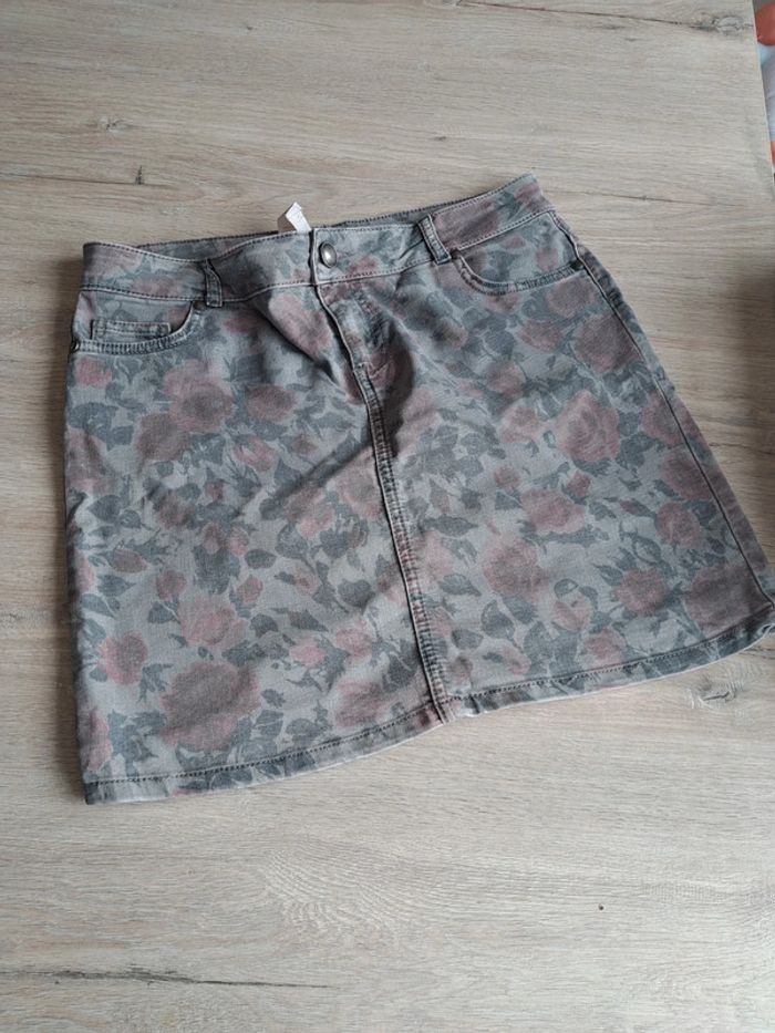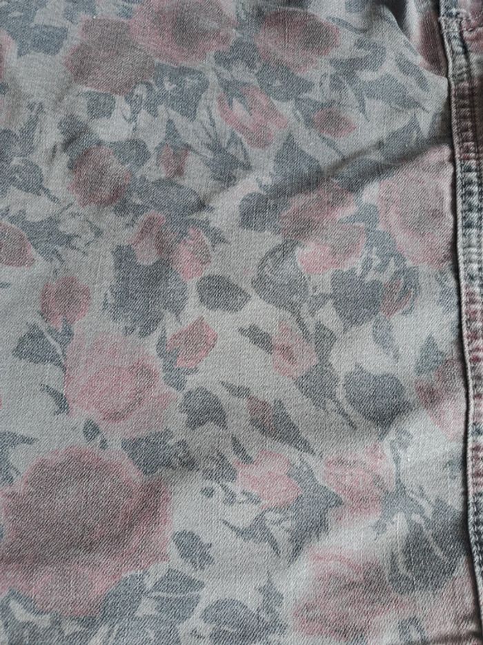 Jupe en jean avec motifs fleuries en très bon état, taille 40