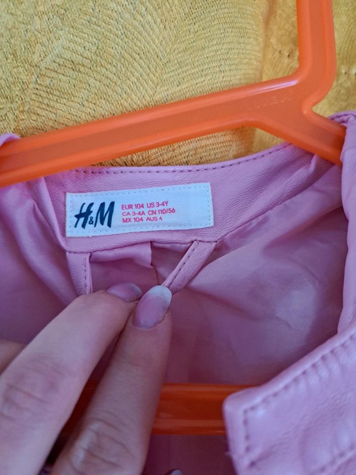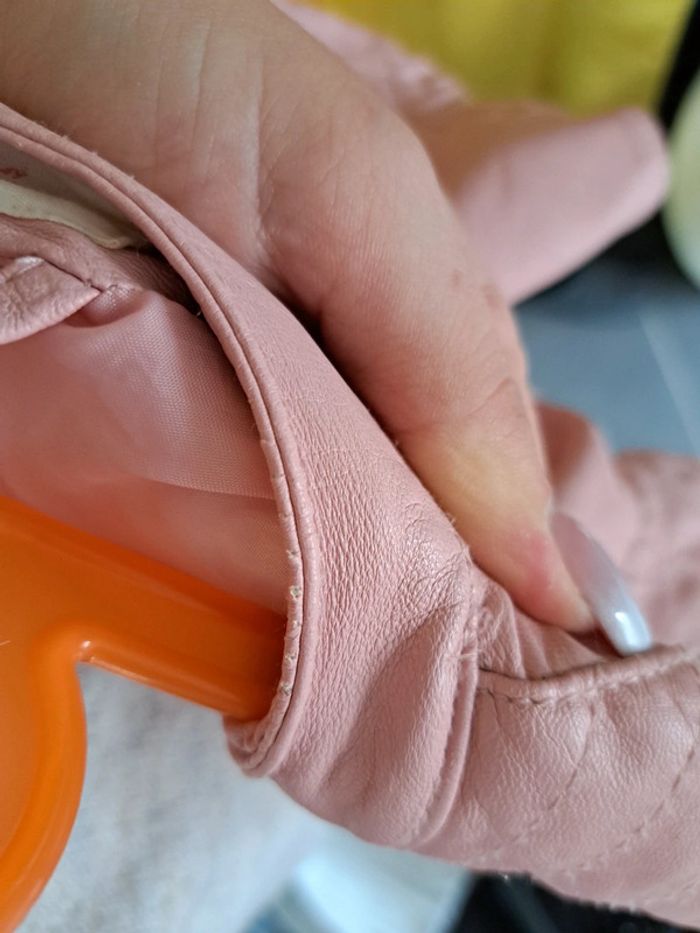 Veste en cuir Rose en bon état juste un peu abîmée à l encolure, taille 3/4 ans