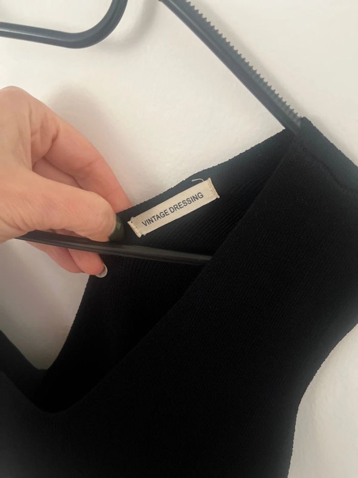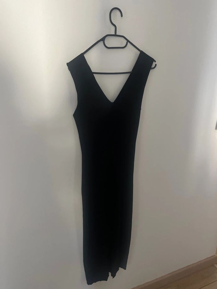 Je vends cette jolie robe noire décolletée devant et dos , matière très agréable et près du corps Les dimensions sont de 115x33 cm Convient aussi bien pour une occasion ( avec des accessoires plus chic) que pour le bureau ( avec blazer ) ou en mode décontracté ( avec veste en jean et baskets) Très peu portée , excellent etat