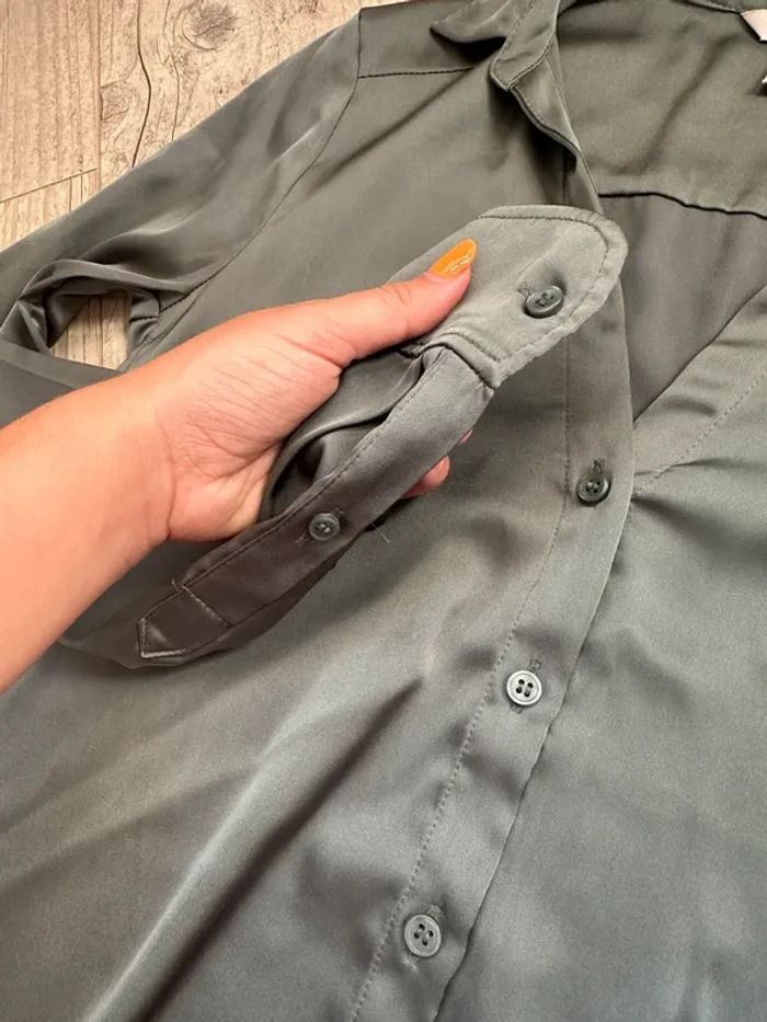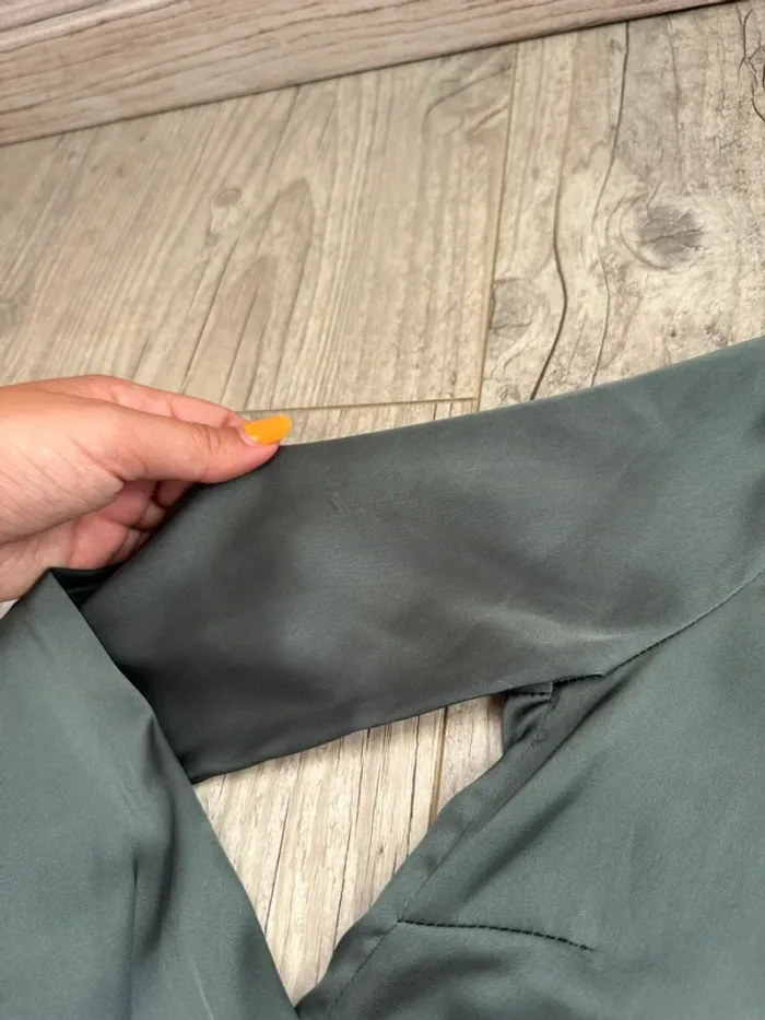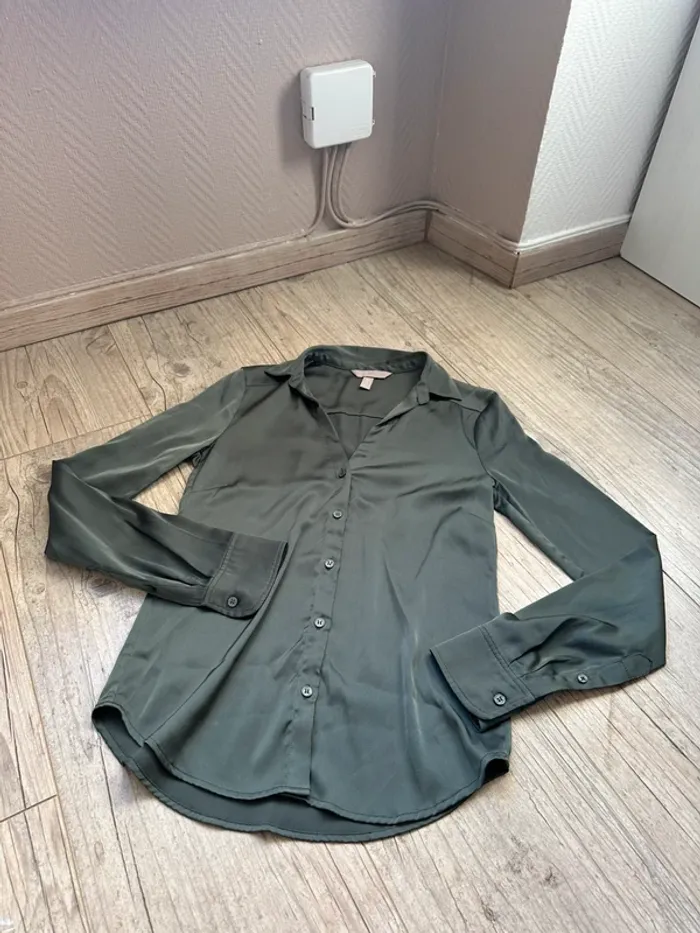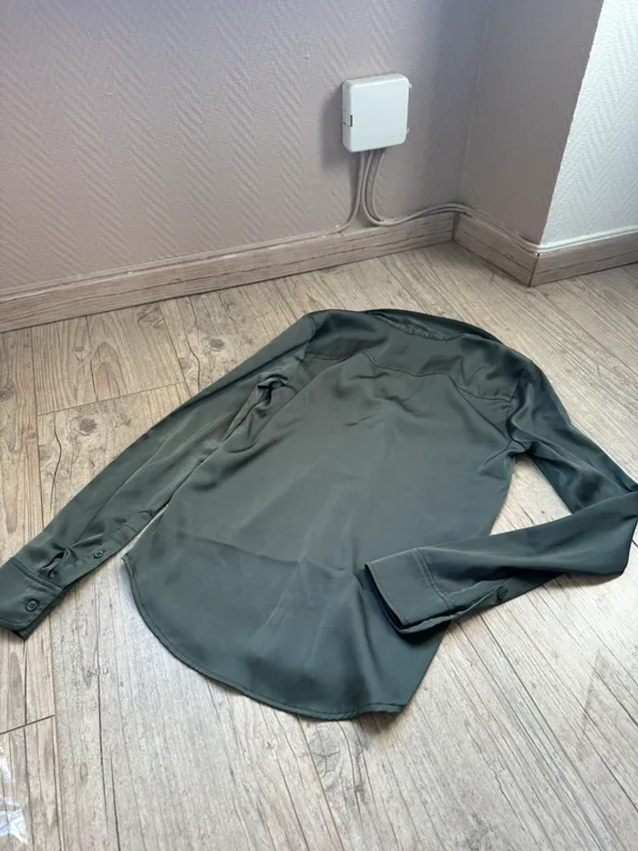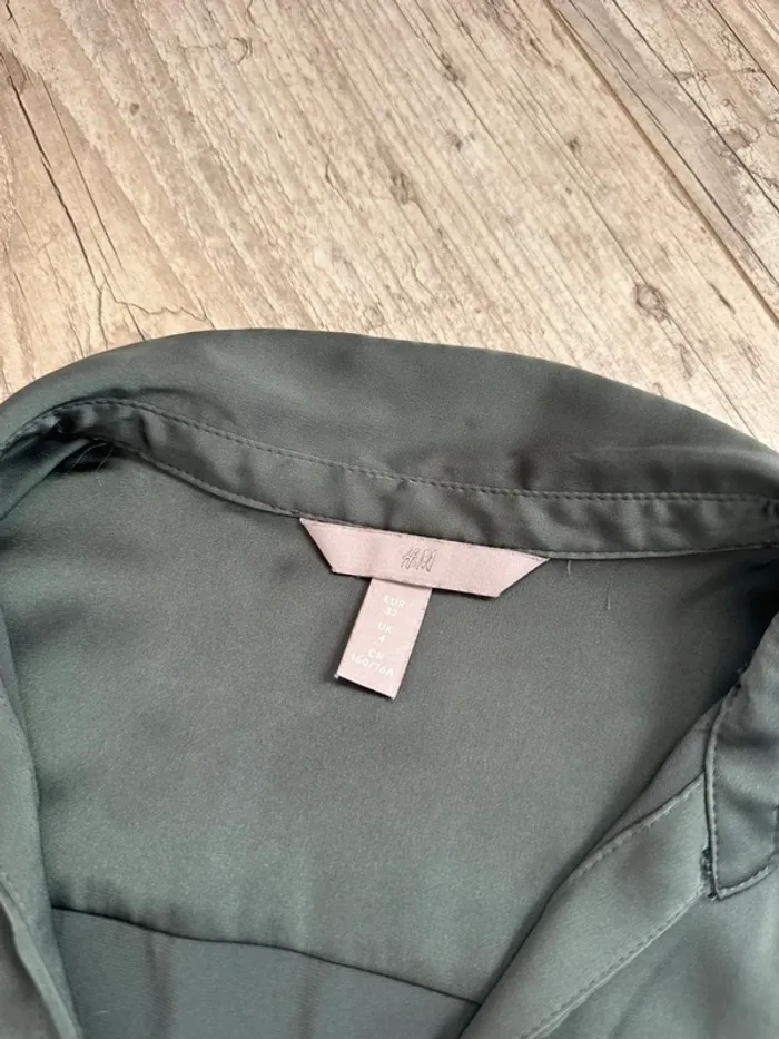 Chemise satinée vert foncé hm Taille xxs 32 Très bon état mis à part 1 défaut du tissu(voir photo 3) Envoi rapide et soigné Pas de photo porté Porté 2/3 fois pas plus