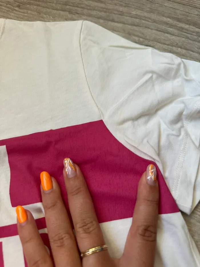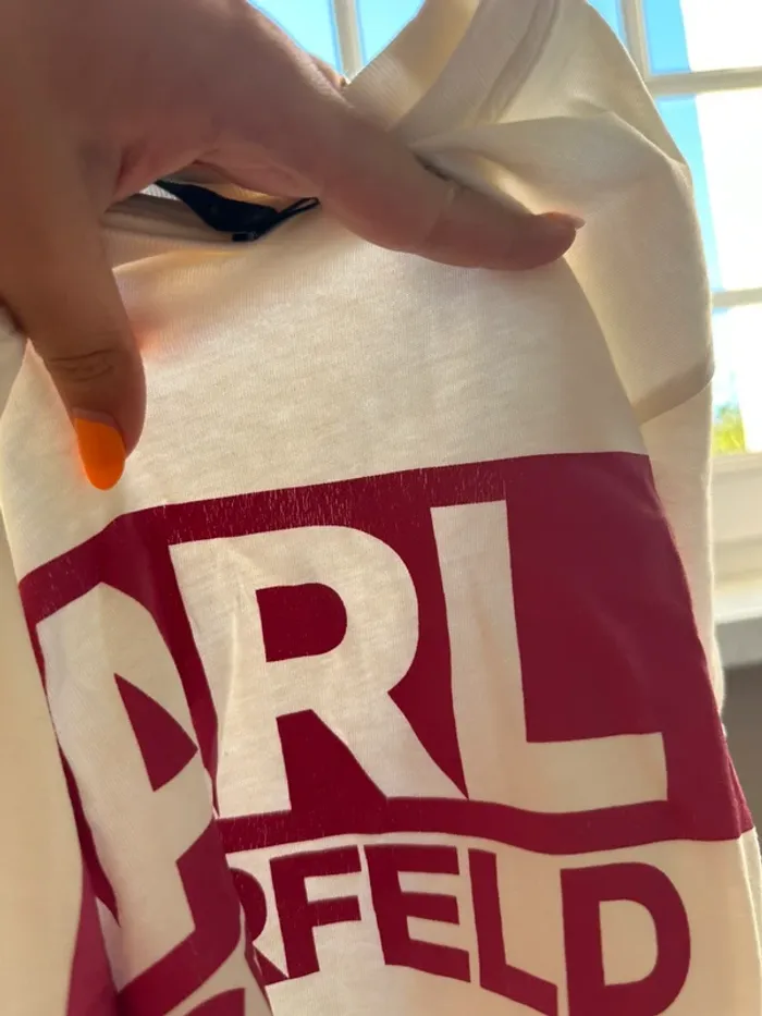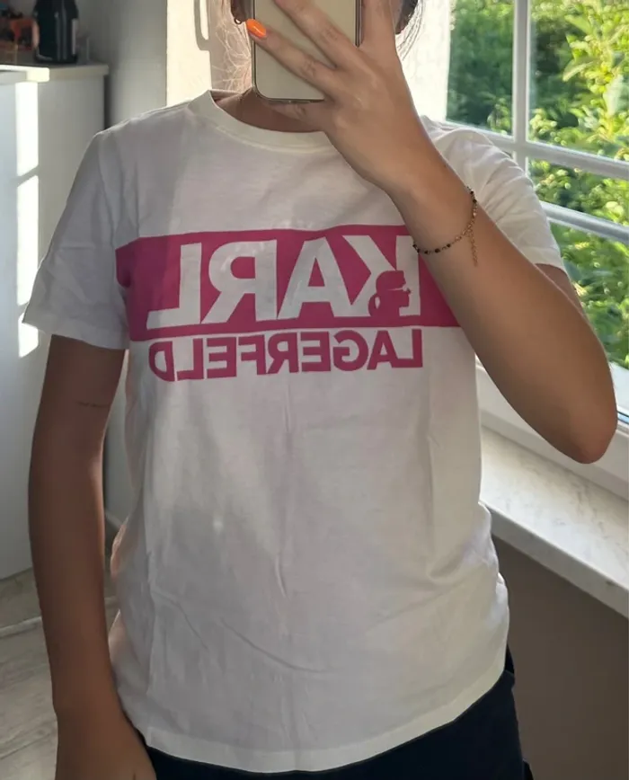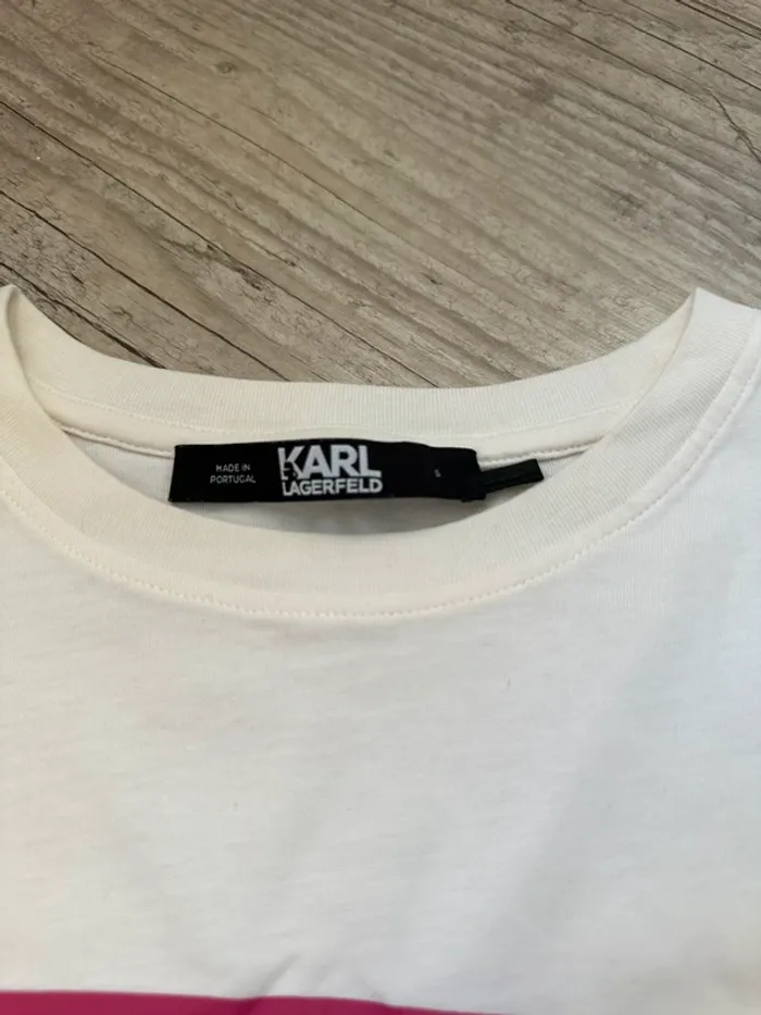 Tee shirt karl lagerfeld crème rose Taille S 36 en très bon état général ATTENTION à l'imprimé rose qui a tendance à s'être un peu étiré !! —> Voir photo mais cela se voit surtout lorsqu'on le plie ou qu'il est tenu droit à la lumière, exemple sur les photos, autrement porté non. Porté 2-3fois Soyez bien conscient de ce détail svp Envoi rapide et soigné