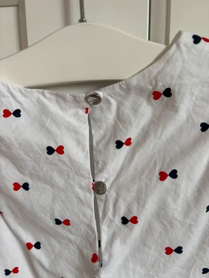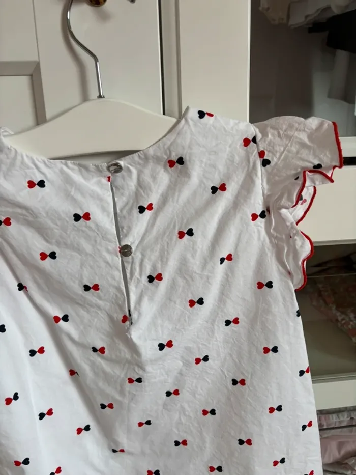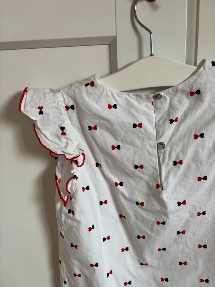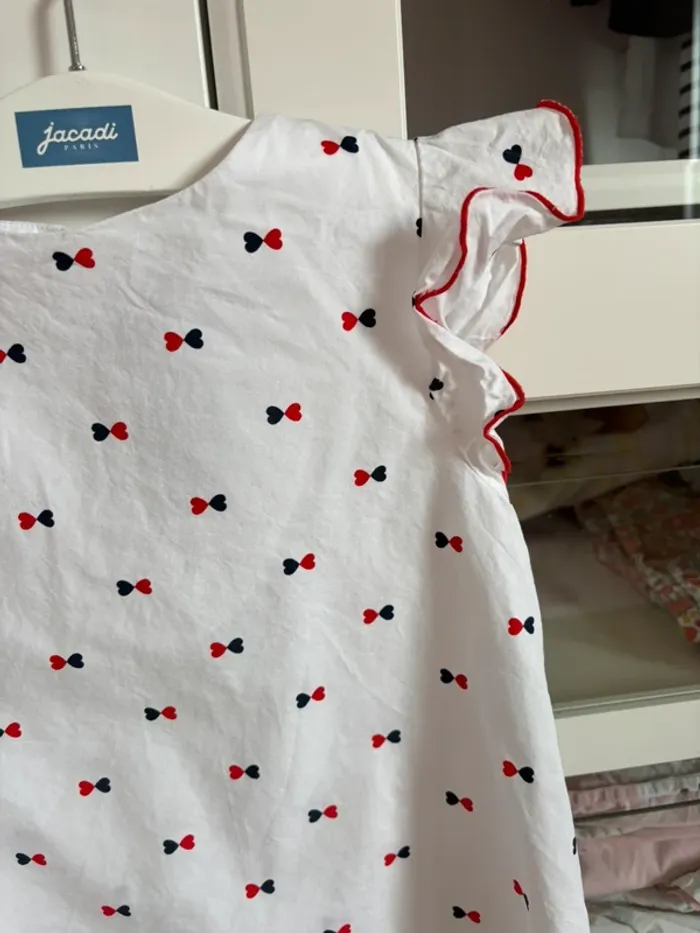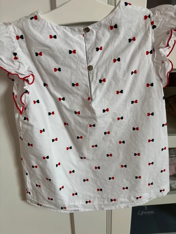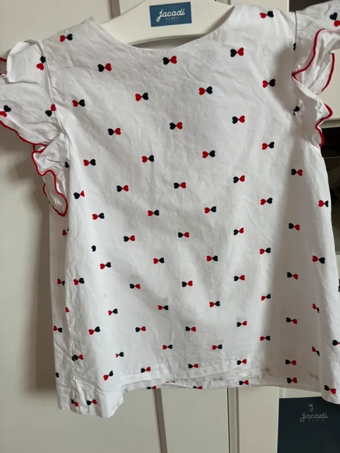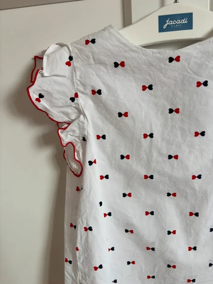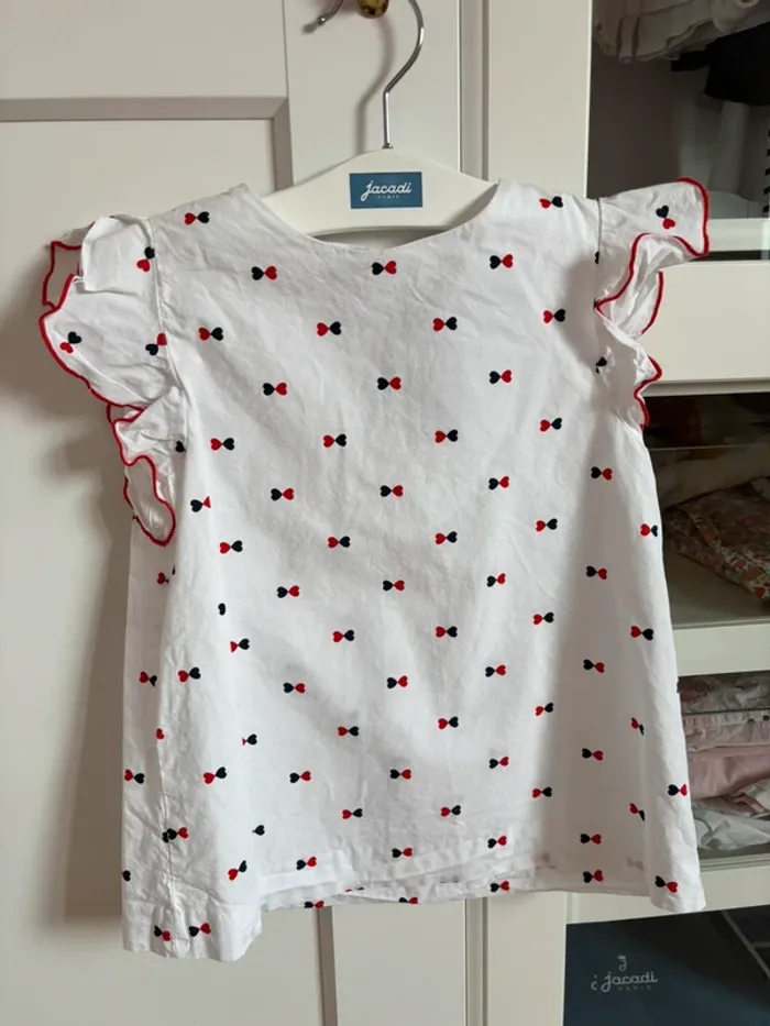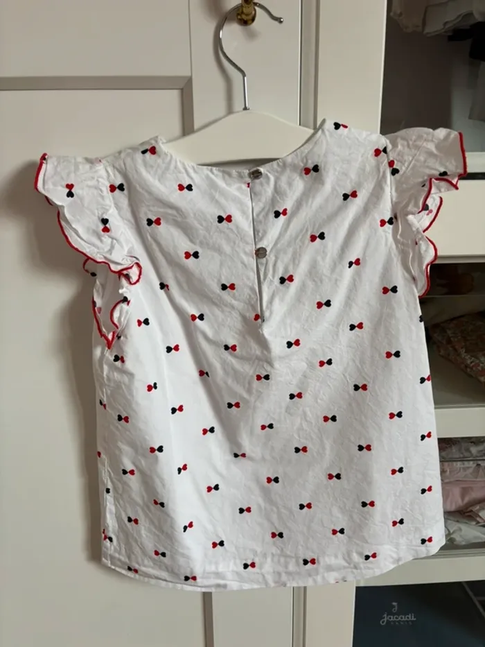 Blouse blanche avec manches courtes à volants Imprimés noeuds marine et rouge Taille 8 ans 128 cm Marque Jacadi Peu portée entretenue avec soin prix fixe merci