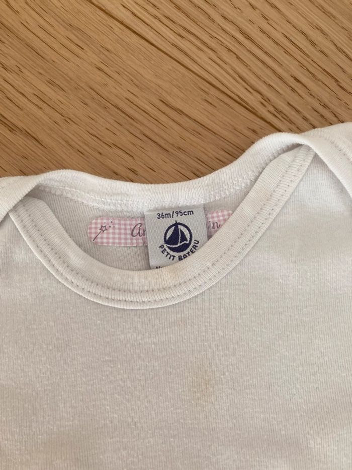 Body uni blanc en coton Marque Petit Bateau Taille 36 mois 96 cm En bon état car tâches et étiquette avec le prénom de ma fille