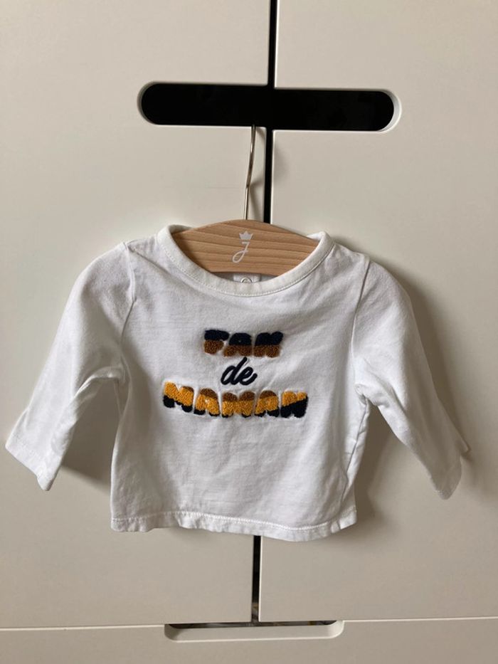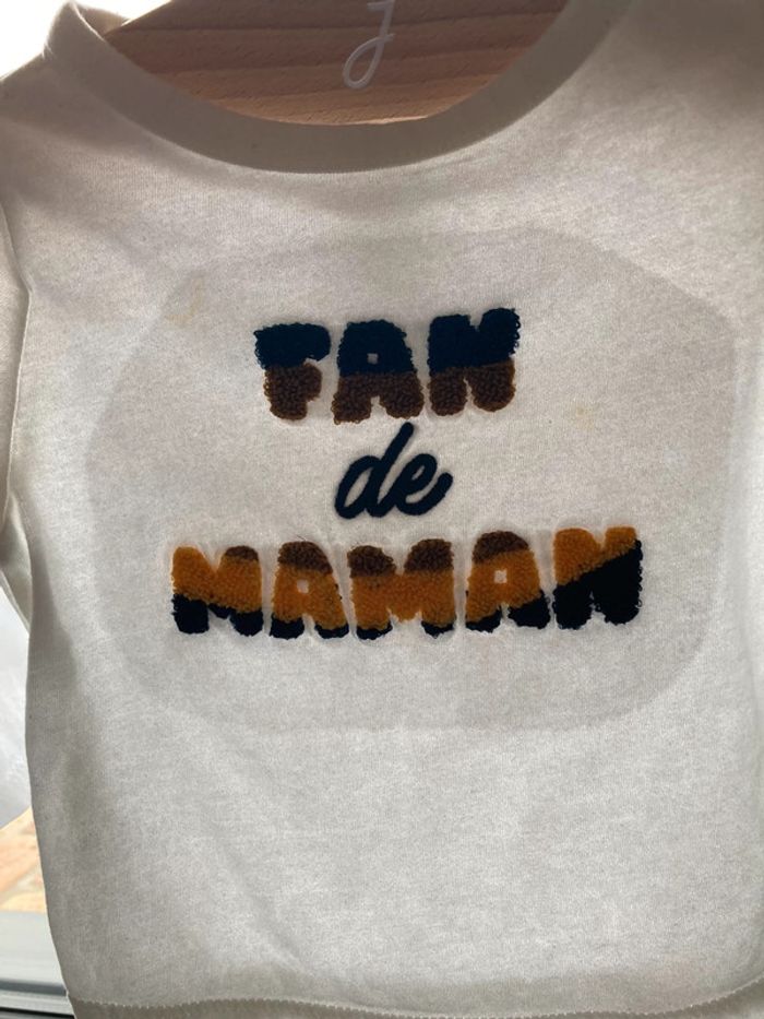 Tee-shirt blanc en coton Inscription fan de maman Marque TAO Taille 9 mois 71 cm En TBE très peu porté présente juste deux petites taches jaunes voir dernière photo à la lumière