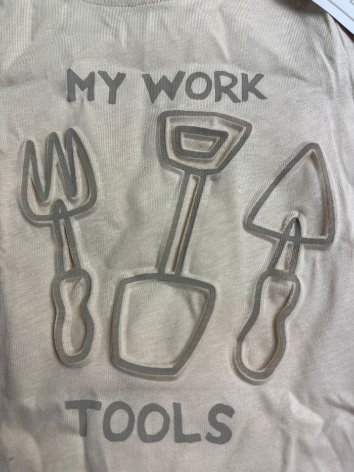 T-shirt bébé en coton beige, signé Orchestra, avec imprimé rigolo “My Work Tools”.