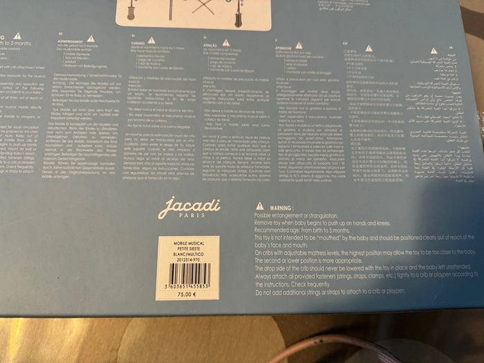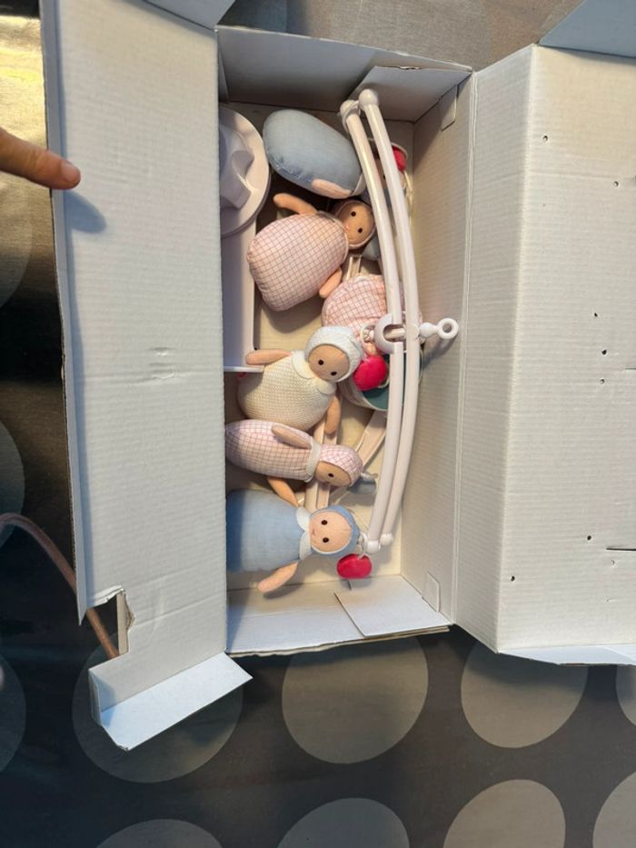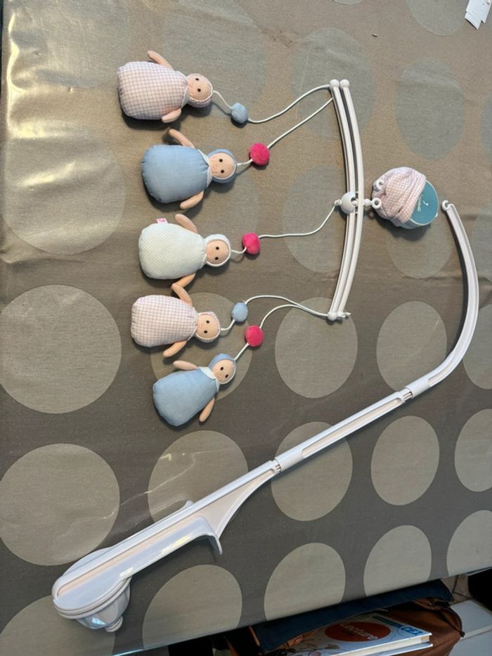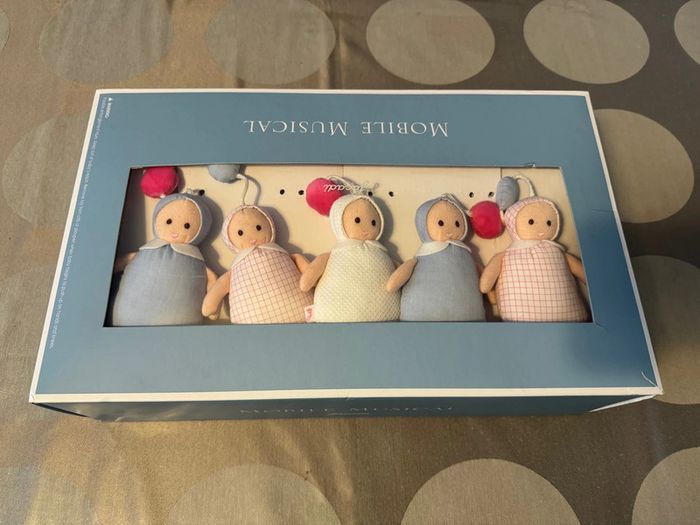 Mobile musical en parfait état avec boîte d’origine Valeur 75€ Utilisé juste en déco J’ai aussi le boulier/guirlande de poupées Joséphine jacadi