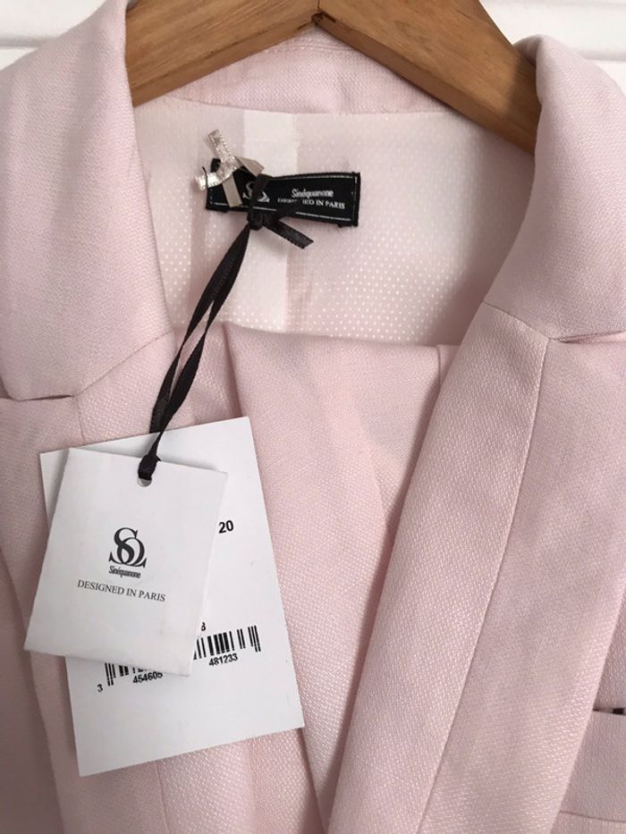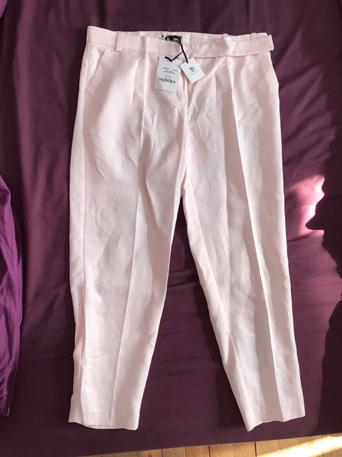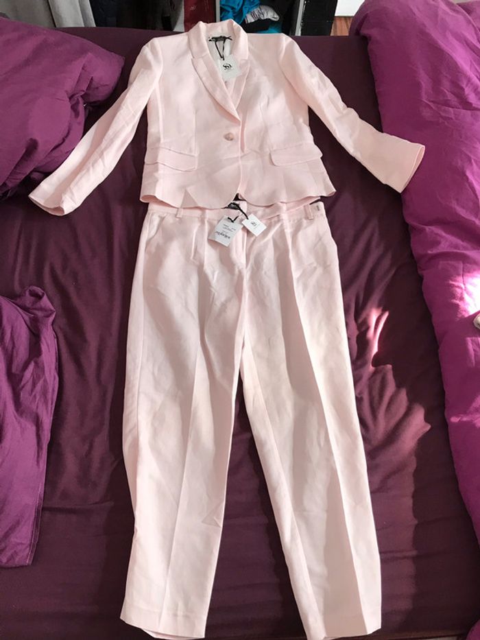 neuf avec étiquette taille 40 pour le pantalon (voire un 38 car ça ne taille pas grand) et 38 pour la veste en lin rose poudrée pantalon 3/4
