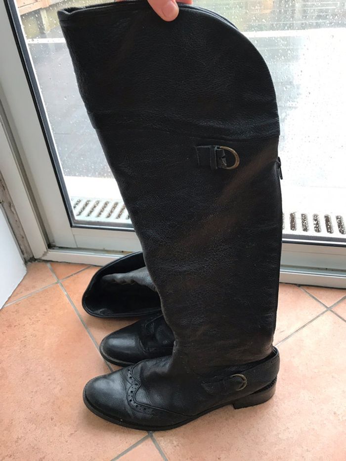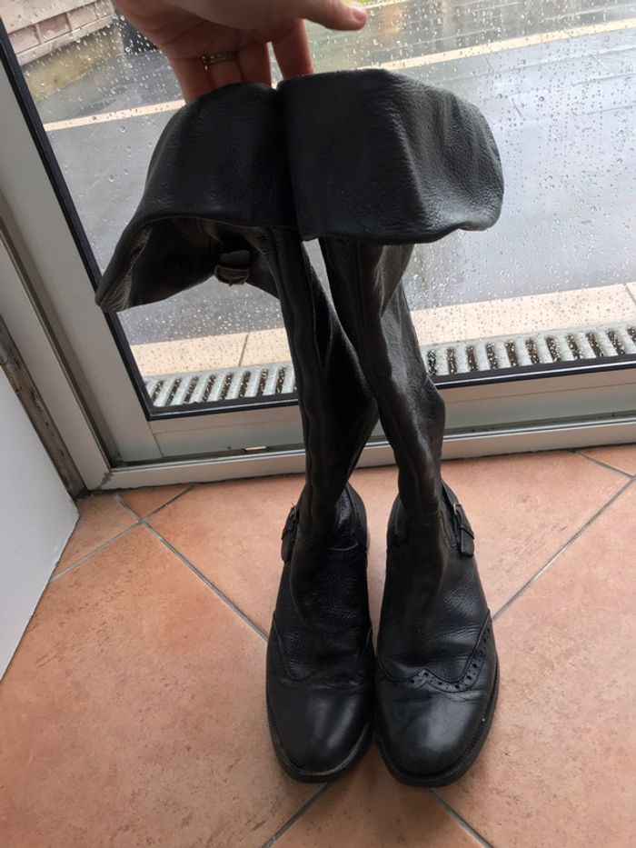 bottes cuissardes qui montent jusqu’au genoux. il y a une partie qui se replie pour arriver juste en dessous du genou