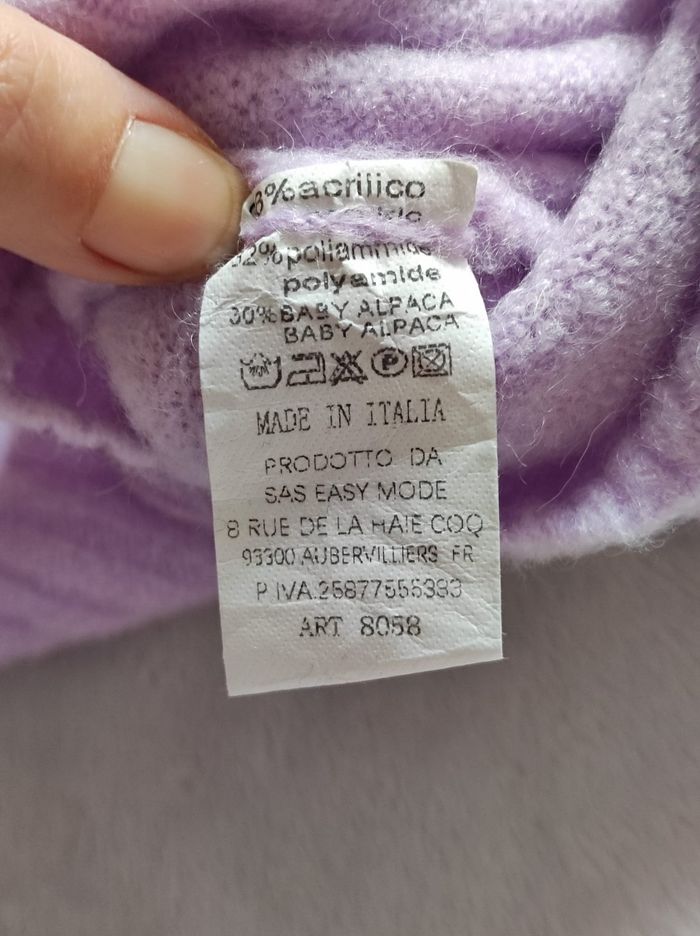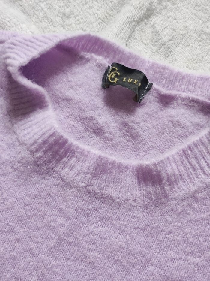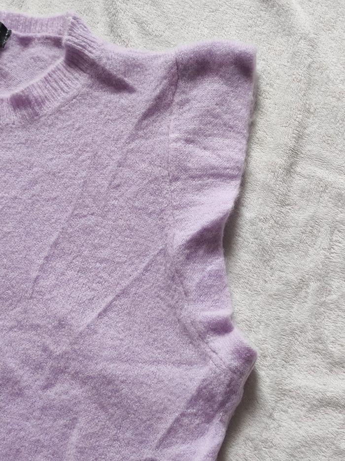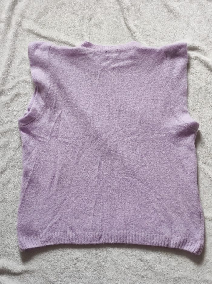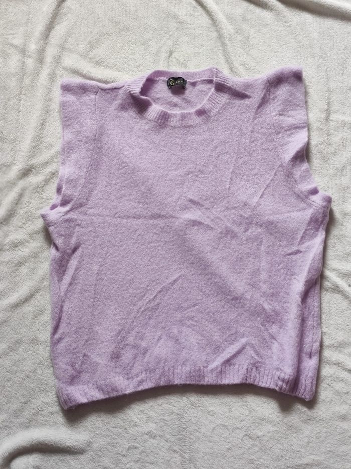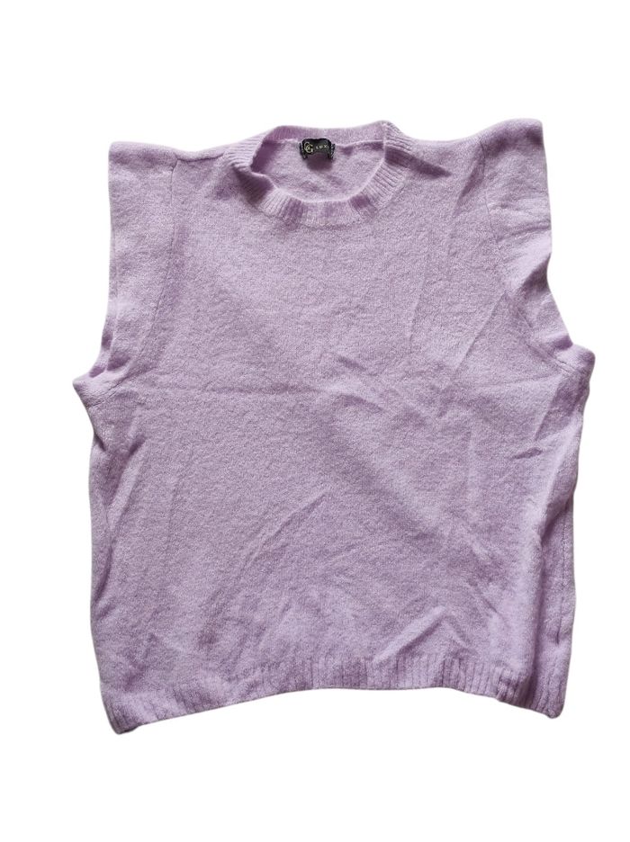 joli pull sans manches contour effet volant. De couleur mauve / lilas Matière douce, légère et agréable à porter. Matière extensible. 88% acrylique, 32% polyamide et 30% baby alpaga. Marque luxe en taille unique Dimensions Épaules 40 cm Aisselles 56,5 cm Tour de taille 54 cm Hauteur 66 cm En parfait état, ni trous tâches ou déchirures.