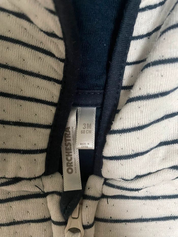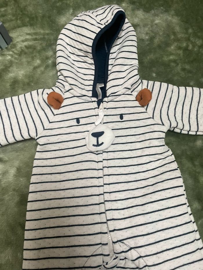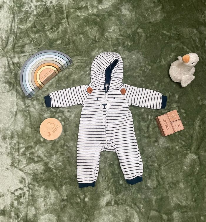 • Combi pilote longue en double jersey. • Très bon état porté 1 fois ! • Capuche avec intérieur contrasté uni. •Ouverture zippée sur le devant. •Oreilles d'ours contrastées en relief, yeux et nez brodés sur le devant. • Orchestra • Taille 3 mois 60cm •Manches longues avec poignets contrastés. •Ouverture pressionnée à l'entrejambe. • Acheté 30 euros Retrouvez tout mes vêtements taille 3 mois sur : #3moislaurapolska des réductions sont prévus pour des lots 🌷 🧸 •Chevilles contrastées. •Rayures et mini-pois all-over.