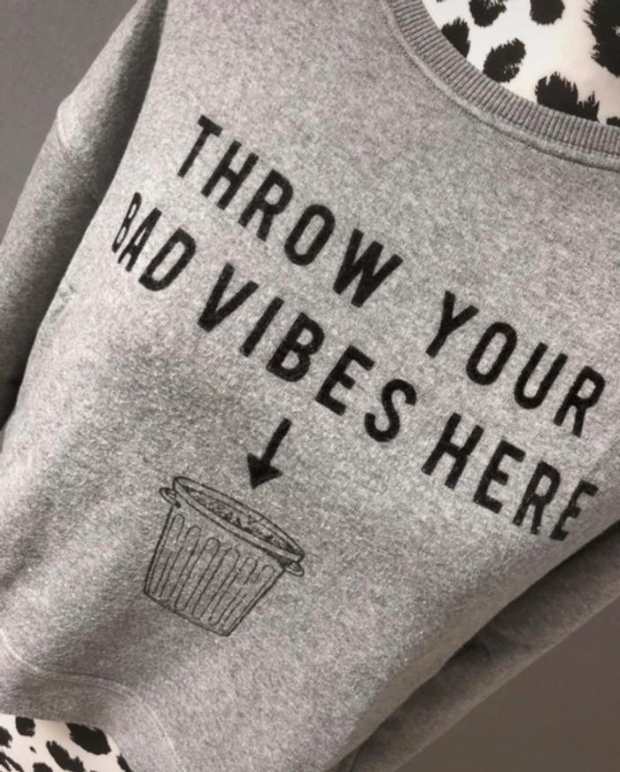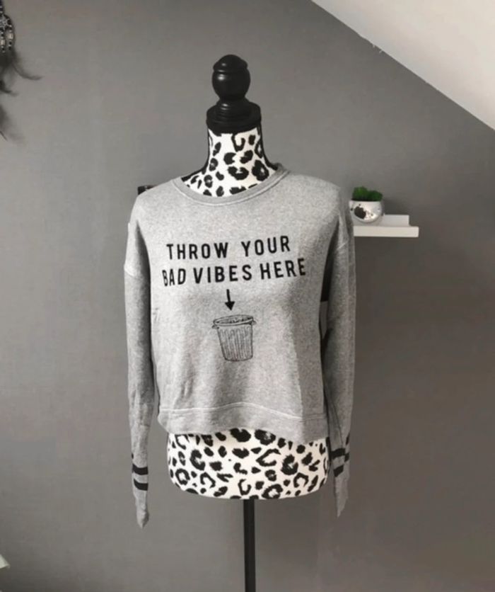 •Pull gris matière très douce, écriture & motif poubelle noire. •Détails rayés aux manches. • Très Bon état • Taille M mais correspond aussi à un S Retrouvez tout mes vêtements taille S sur ce # #habitstailleslaurapolska 🌈