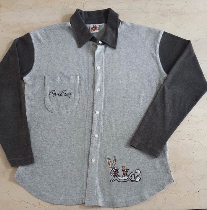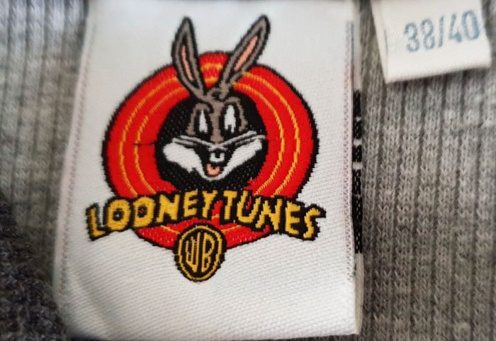 Gilet Looney Tunes Bugs Bunny bicolore (gris clair et gris foncé) en taille 38/40. Taille (du haut du col au bas) : 71 cm - Manche (à partir du gris foncé/démarrant à 9 cm en dessous de l'épaule) : 53 cm. Maison non-fumeur sans animaux.