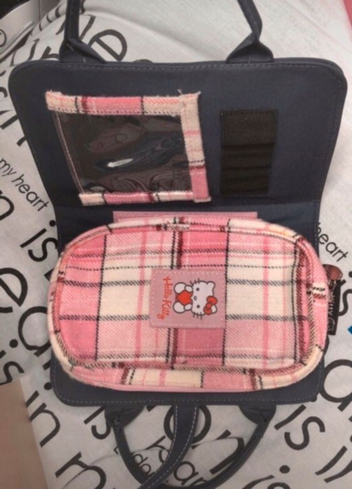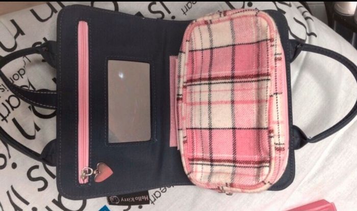 Petit sac composé d’un miroir, et d’un porte monnaie qui se détache à l’aide un scratch. Il est en parfait état ! Pleins de petits rangements