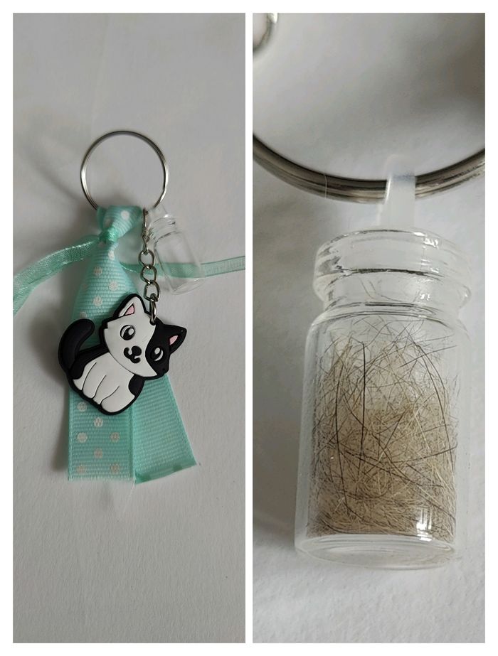 Porte clé souvenir, fiole à remplir de poils Vous avez perdu un animal, vous voulez en garder un souvenir ? Avec ce porte clé vous pouvez mettre des poils de votre animal dans la fiole #animal #chat #chien #souvenir #fiole