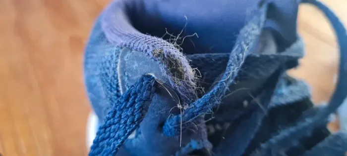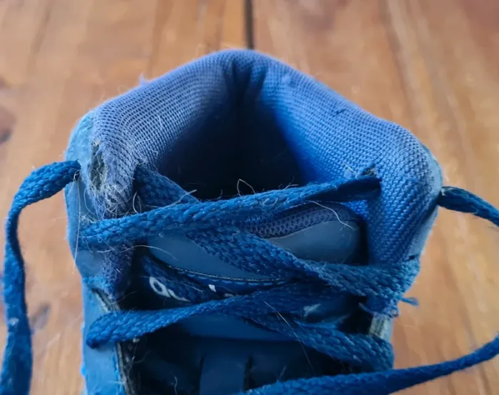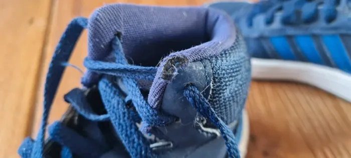 Paire de baskets adidas Pointure 28. En bon état général sauf sur chaque extrémité de la partie extérieure du haut de la chaussure (voir photos). Ca ne gêne pas à l'utilisation de la chaussure.