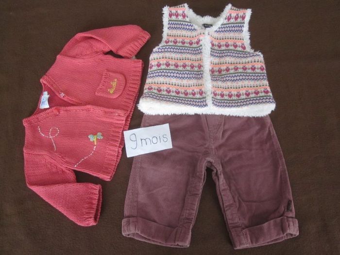 9m, boléro moumoute + 2 hauts ml + robe bretelles + robe ml + gilet + 2 pantalons, disney, brioche, les bb sont comme ça, tao