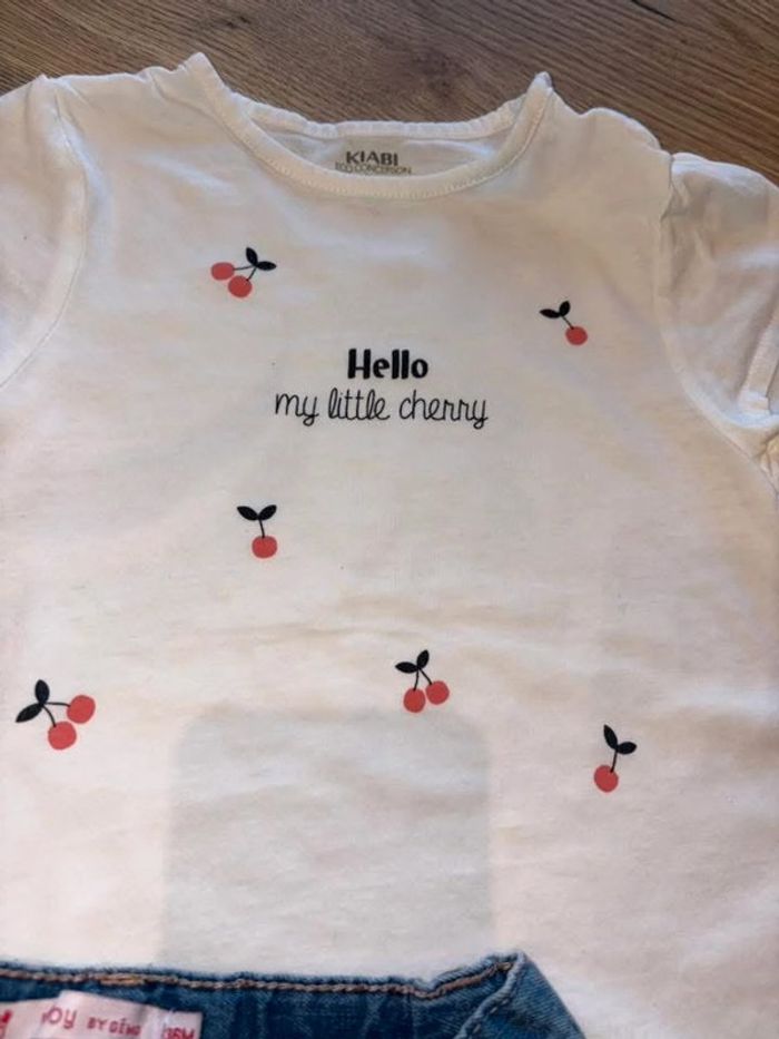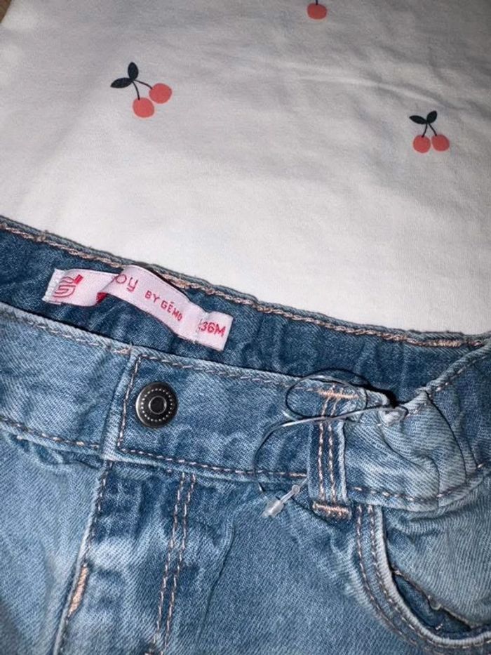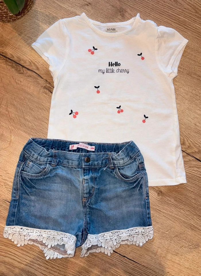 Tee shirt kiabi cerise neuf juste lavé + short en jean gemo dentelle neuf avec attache à couper Taille 36 mois Laisse à 8,5e