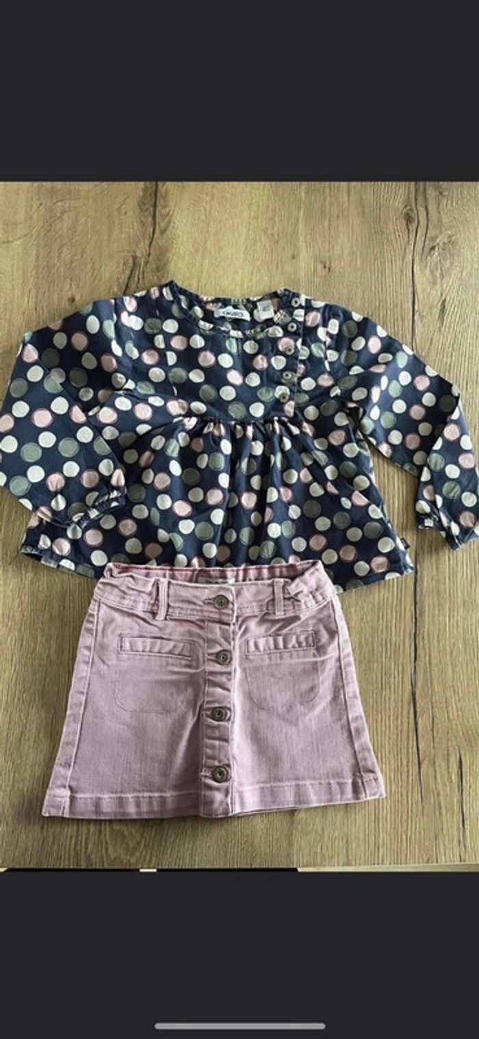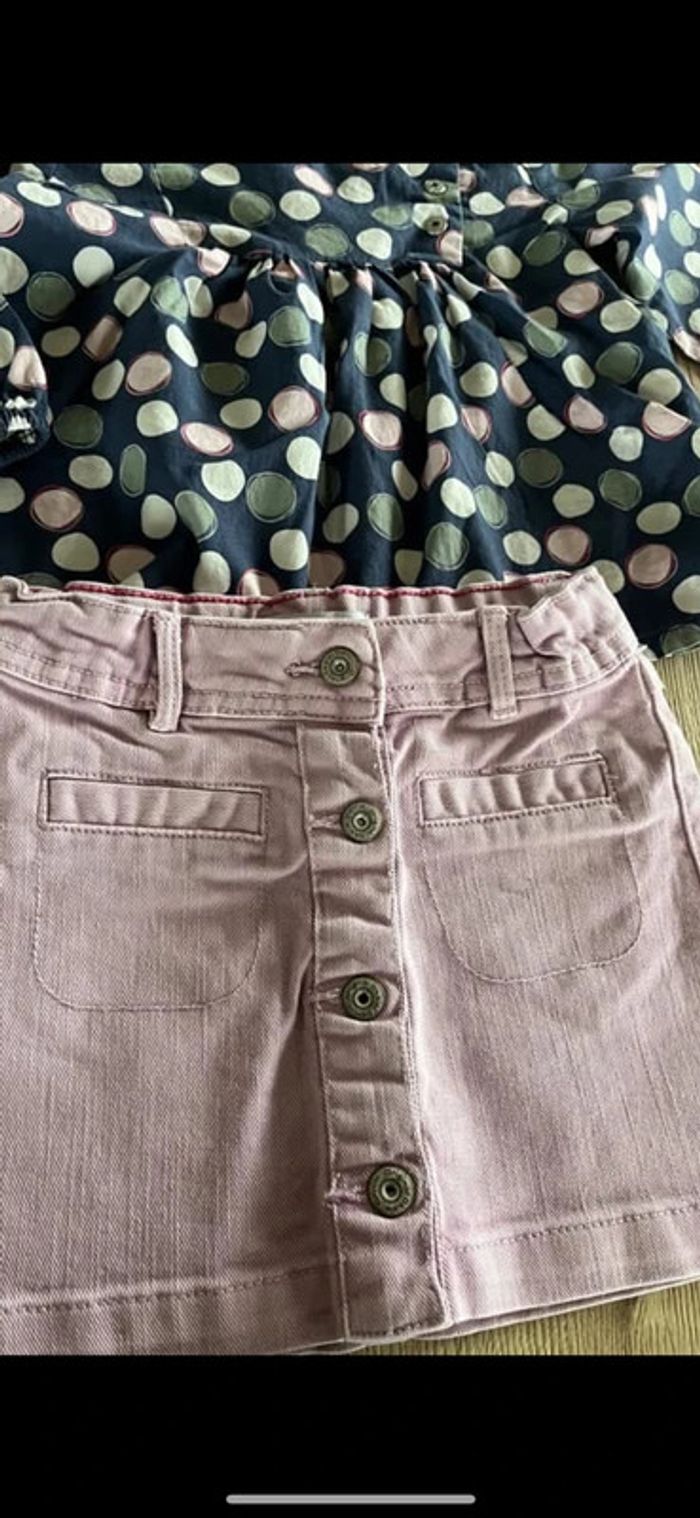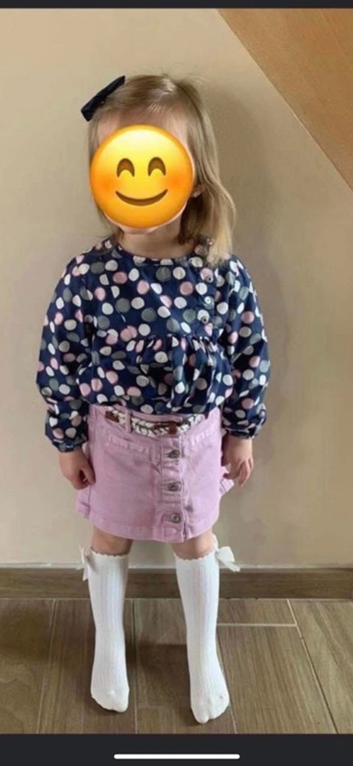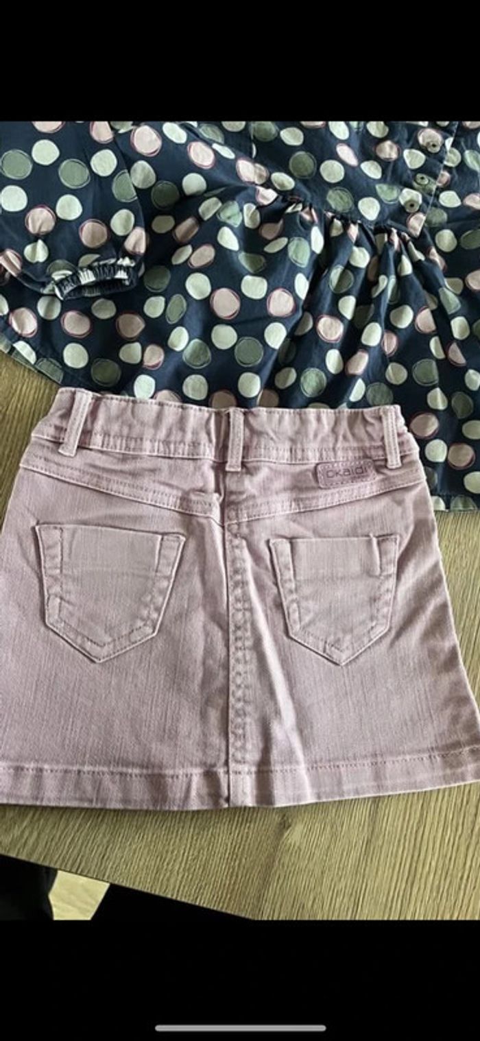 Ensemble okaidi mi saison En 3 ans , Jupe en jean rose + blouse En parfait était laisse à 9 e