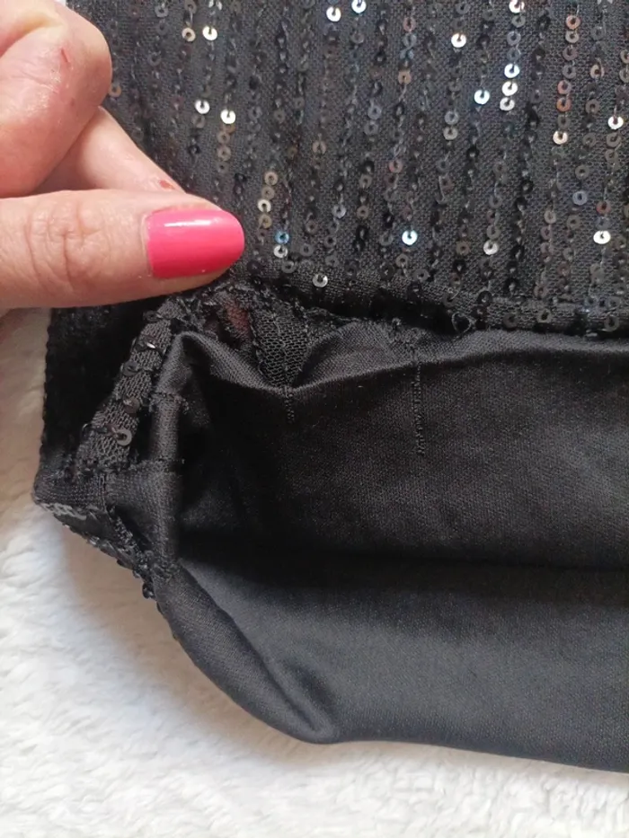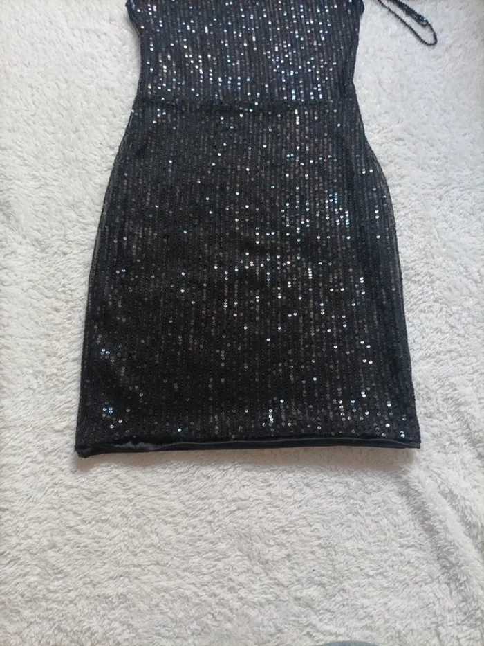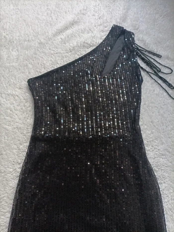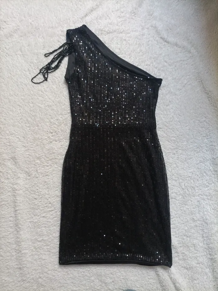 Robe courte moulante à sequins, asymétrique avec fantaisie sur l'épaule en très bon état, attention la doublure s'est décousue à un endroit voir photo.