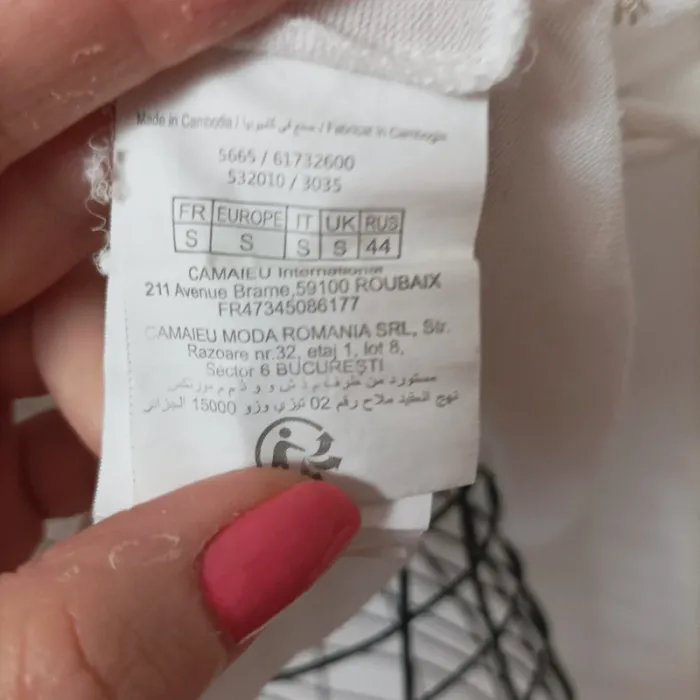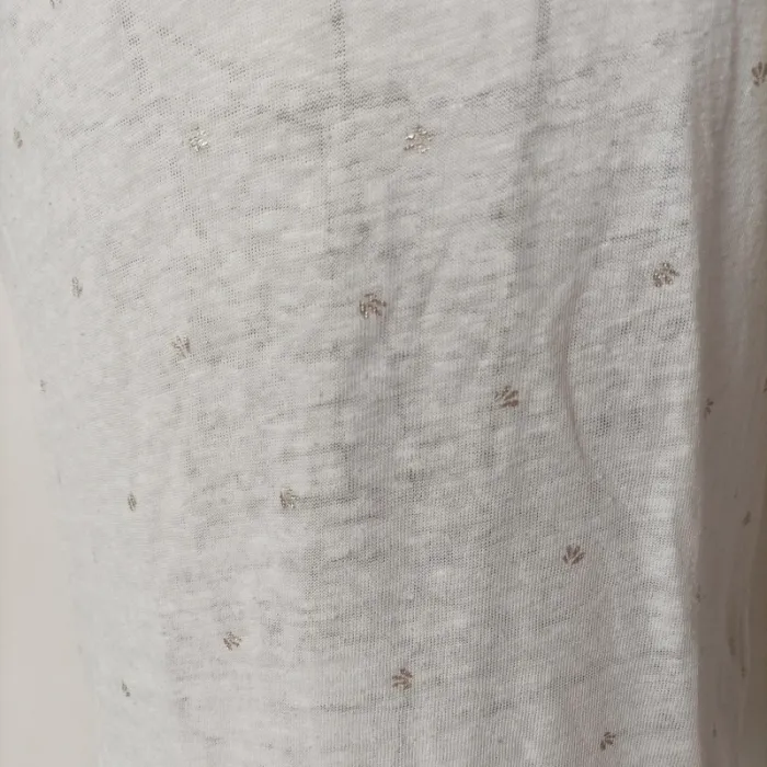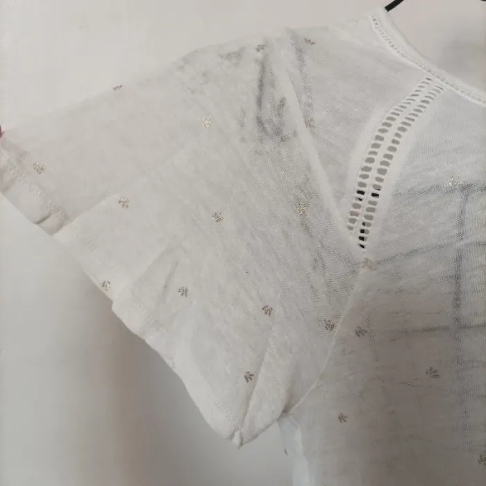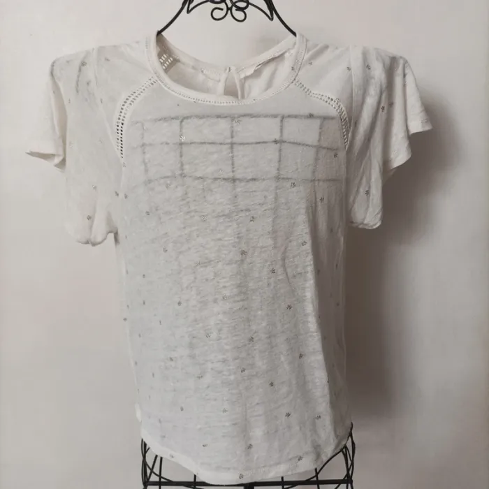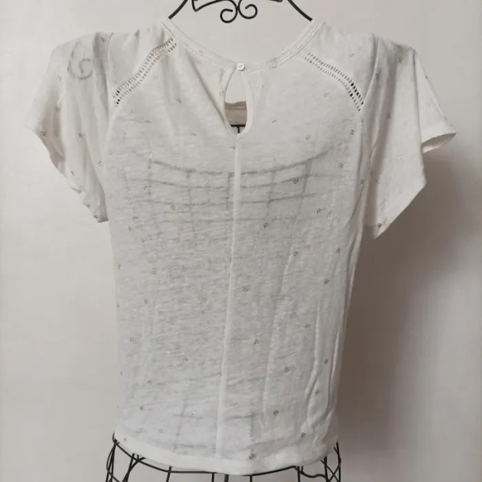 Blouse Camaïeu taille 36 légèrement transparente blanche avec motifs argentés en très bon état D'autres affaires dans mon dressing #valkyetcie_36femme #36femme #femme36 #blousefemme36 #blouse36femme #blousemanchescourtes