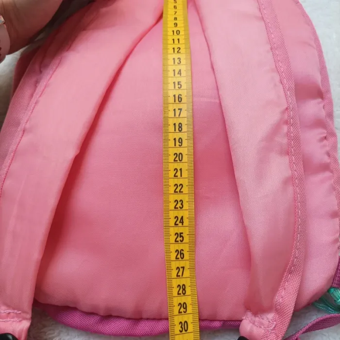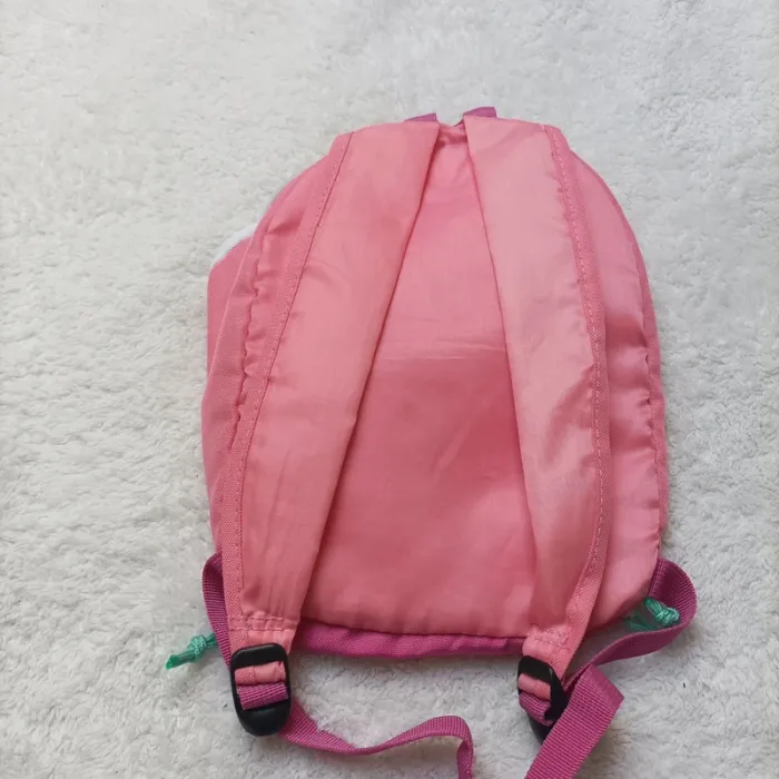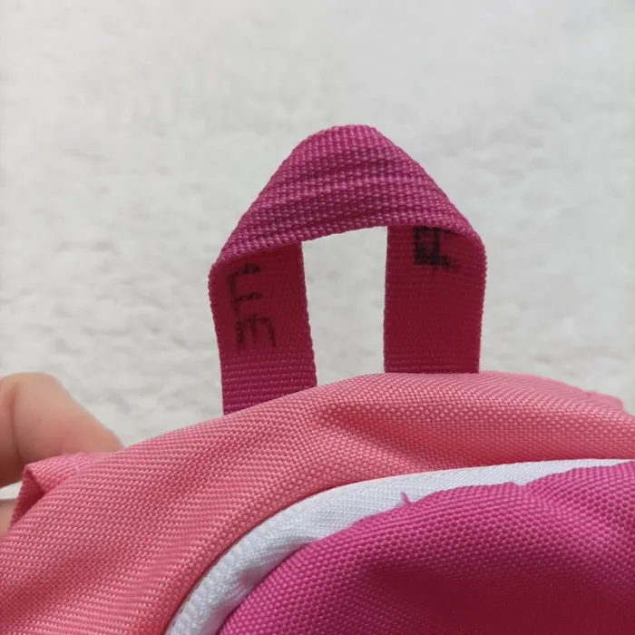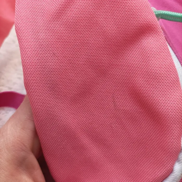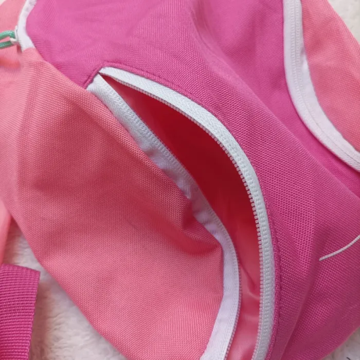 Petit sac à dos souple deux compartiments en très bon état juste une marque non partie au lavage visible sur la photo. Le nom de ma fille avait été écrit au marqueur sur la anse ne s'efface pas.