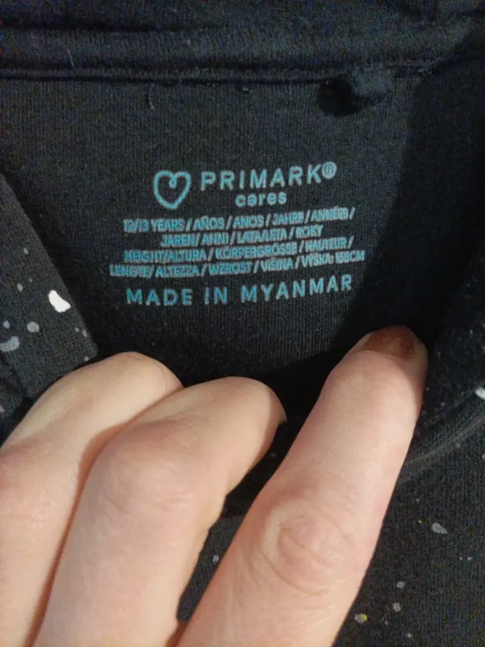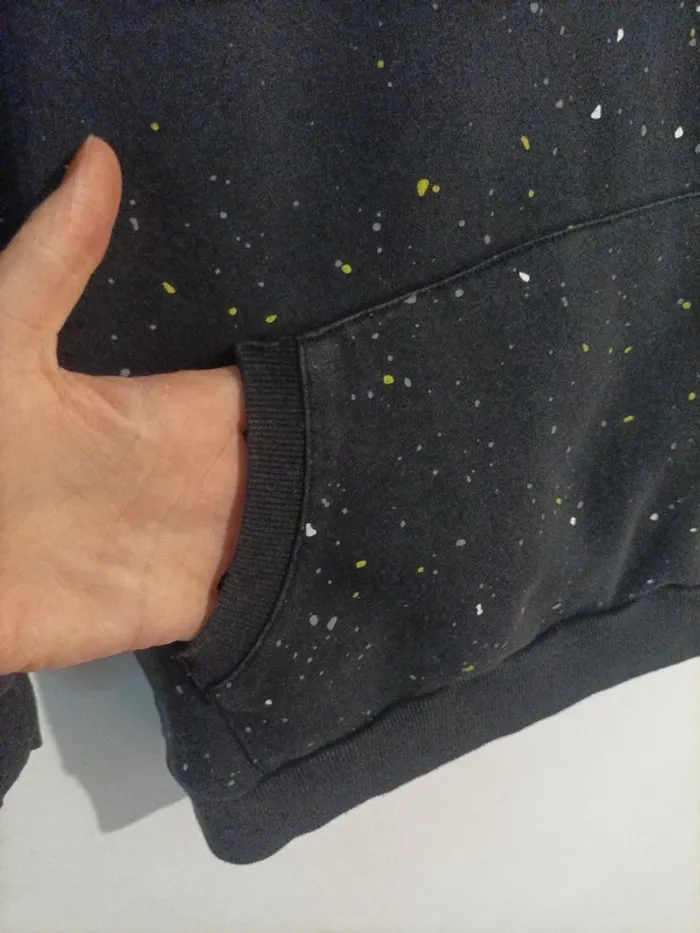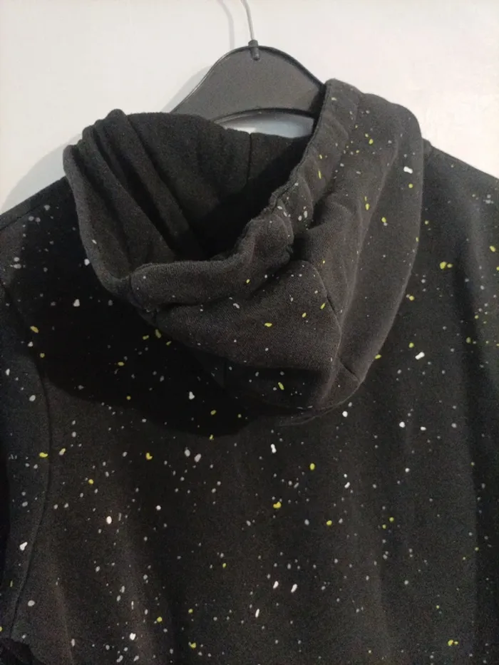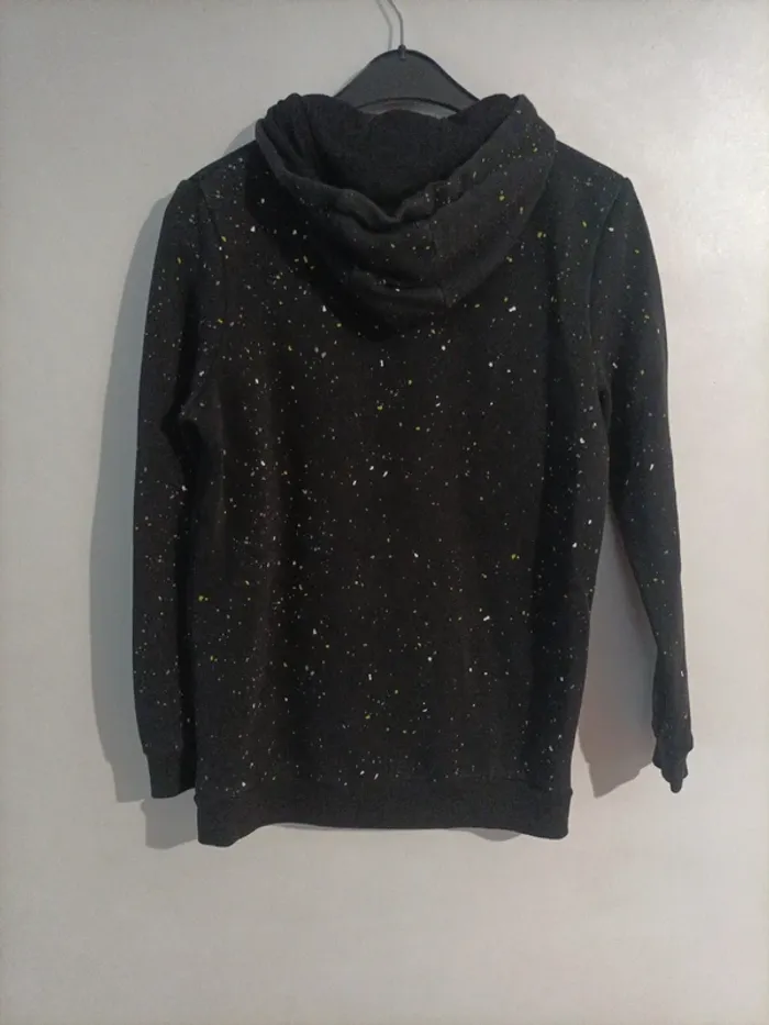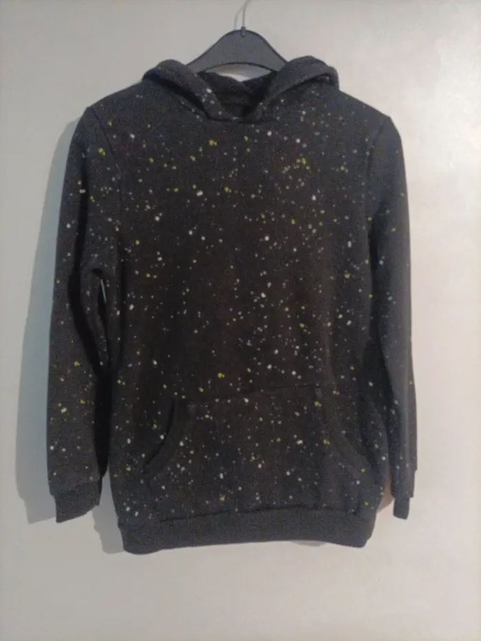 Sweat noir effet tâches jaunes blanches et grises à capuche avec poche kangourou taille 12/13 ans Primark très bon état