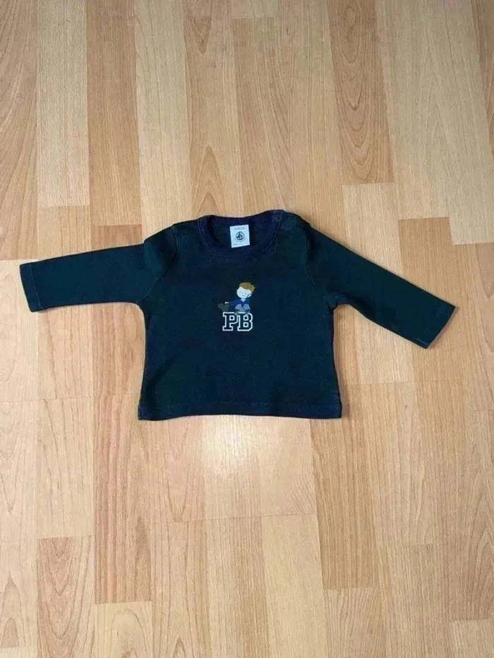 T-shirt Petit Bateau manches longues vert foncé, taille 3 mois - Très bon état - photo numéro 1