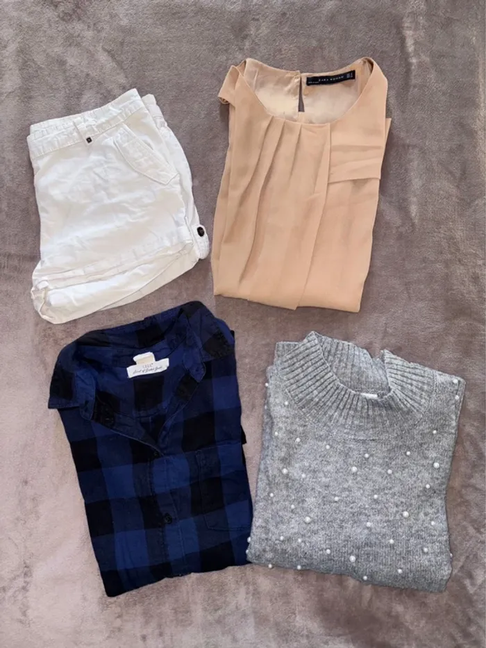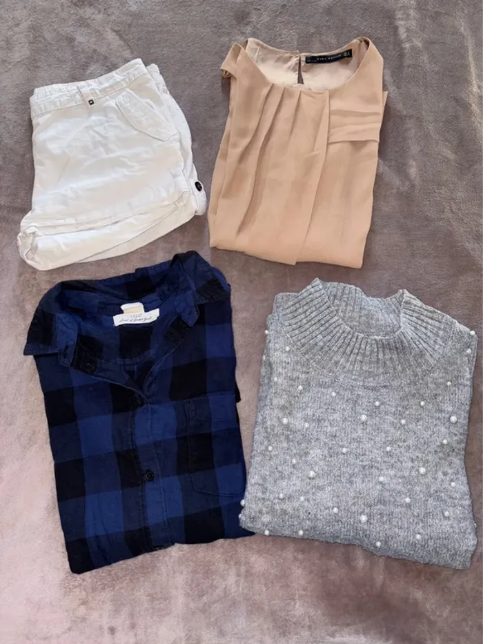 Lot de 4 vêtements femme taille S comprenant : - 1 Pull gris perlé Primark en bon état. - 1 Robe beige légère Zara en très bon état. Portée une seule fois pour un mariage. - 1 Short femme H&M blanc en très bon état. - 1 tunique Chemise à carreau h&m en très bon état. #zara #zarawoman #robezara #robezarabeige #primark #pullprimark #hm #hmfemme #shorthm #short #shortfemme ..2leeloo..2moi…