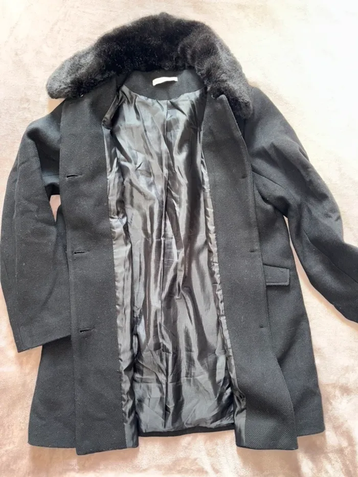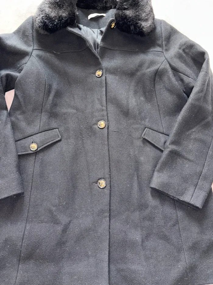Manteau femme taille 40 Armand Thiery à col fourré. Coupe droite. Manches longues. Col à rabat. Fermeture boutonnée droite. 2 poches avant à rabat boutonné au niveau de la taille. Manteau uni en tissu sergé. Fausse fourrure sur le col. Doublure en tissu uni. Boutons effet corne de couleur contrastante. Fente d'aisance au dos. Coutures ton sur ton. Composition en laine mélangée.