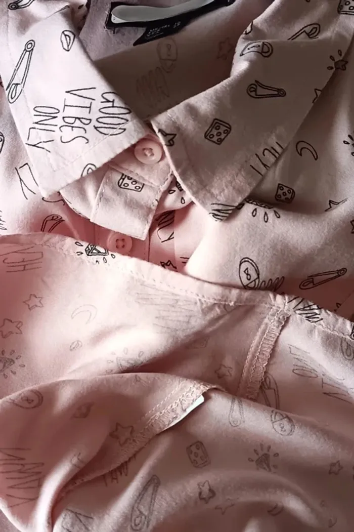 rose clair avec motifs diamant, cadenas, pince à nourrice, lune, étoile... et écriture good vibes only en noir