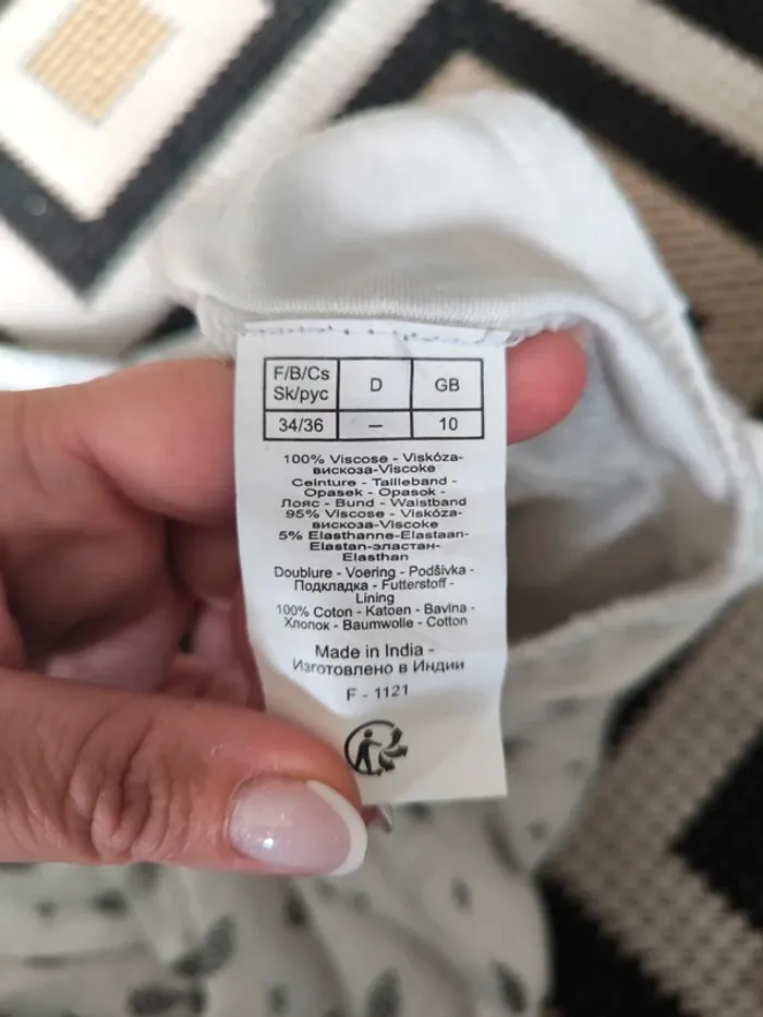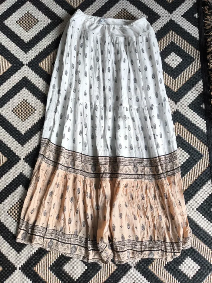 Jupe longue fluide de la marque Blancheporte, au joli imprimé ethnique noir et blanc avec base beige. Coupe plissée, tissu léger et agréable à porter, parfait pour un look bohème chic ou estival. Ceinture élastique à la taille pour un confort optimal. Taille S (34/36) – convient à une morphologie fine ou moyenne. Longueur 94 cm, tombe au niveau des chevilles. Composition : 100% viscose, doublure coton. Fabriquée en Inde. 📏 Dimensions à plat : - Longueur totale : 94 cm 💌 Envoi rapide et soigné Vous pouvez voir tout mon 34 et 36 en cliquant ici 👇 #JLA34 #JLA36 Réf 1000/075