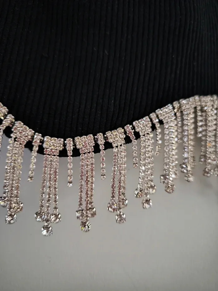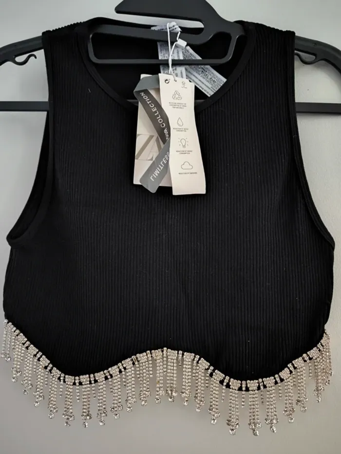 Top noir côtelé de la marque ZARA, coupe crop top, issu de la collection "LIMITED EDITION". Le détail qui fait toute la différence : une sublime bordure de franges en strass argentés, brillants et élégants, parfaits pour un look de soirée ou une tenue chic. 🔹 Taille : M/L – convient pour un 38-40 🔹 État : Neuf avec étiquettes 🔹 Matière : Stretch, confortable et flatteuse 🔹 Détails : Franges en strass scintillants (voir photo) 🔹 Style : Glamour, soirée, festival, événement spécial 📦 Envoi rapide et soigné Vous pouvez voir tout mon 38 40 en cliquant ici 👇 #JLA38 #JLA40 30/60
