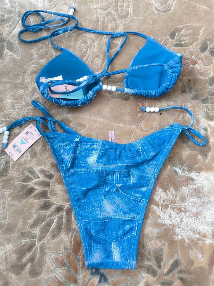 Sublime bikini bleu effet jeans, neuf et jamais porté, avec son étiquette d’origine. Ce modèle est orné de jolies perles blanches sur le haut et le bas, apportant une touche féminine et raffinée. À noter : une des ficelles présente une absence de perles – un détail discret qui n’enlève rien au charme de l’ensemble. Liens réglables pour un ajustement parfait et une coupe flatteuse idéale pour les beaux jours. 👙 Couleur : bleu ✨ Détails : perles blanches (manque quelques perles sur une ficelle), liens réglables 📏 Taille : Si 🏷️ État : neuf, avec étiquette Envoi rapide et emballage soigné 📦 Un look estival à petit prix ☀️ Vous pouvez voir tous mes maillots de bain en 36 en cliquant ici 👇 #JLAmaillot36