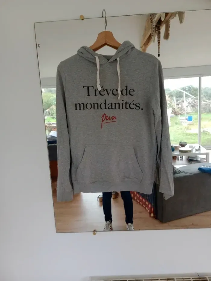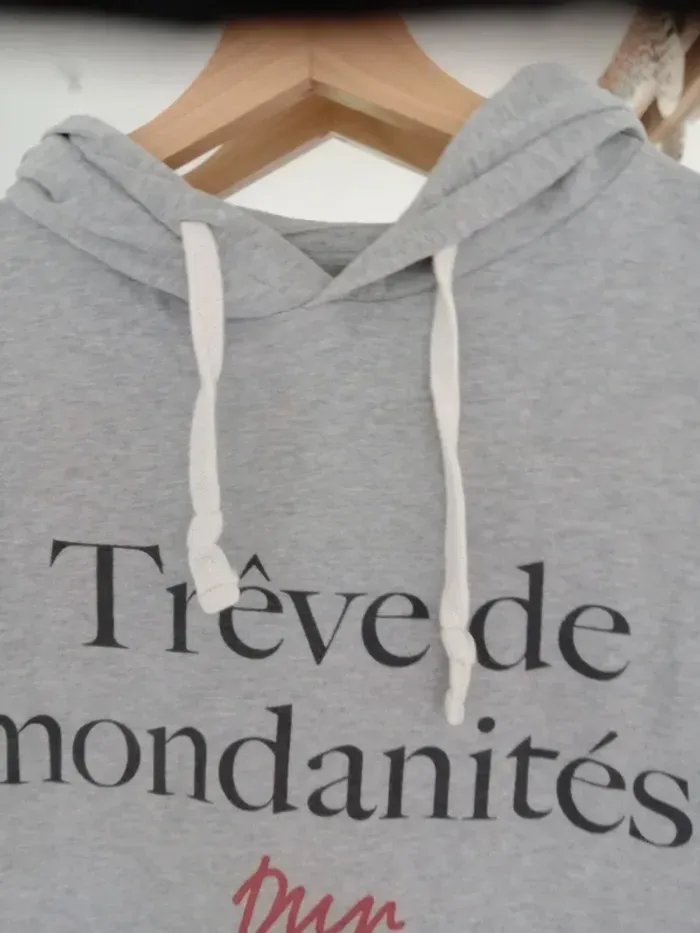 ✨ Hoodie gris chiné avec poche kangourou et cordons blancs. Inscription sur le devant : "Trêve de mondanités" (style casual et tendance). Coupe confortable, parfait pour un look décontracté. Taille s pour homme et m pour femme car mixte Épaule à épaule 40 cm Longueur 64 cm Une couture a été faite sur le côté droit voir dernière photo Idéal pour la mi-saison ou pour un style cosy et urbain. #carineleray_homme