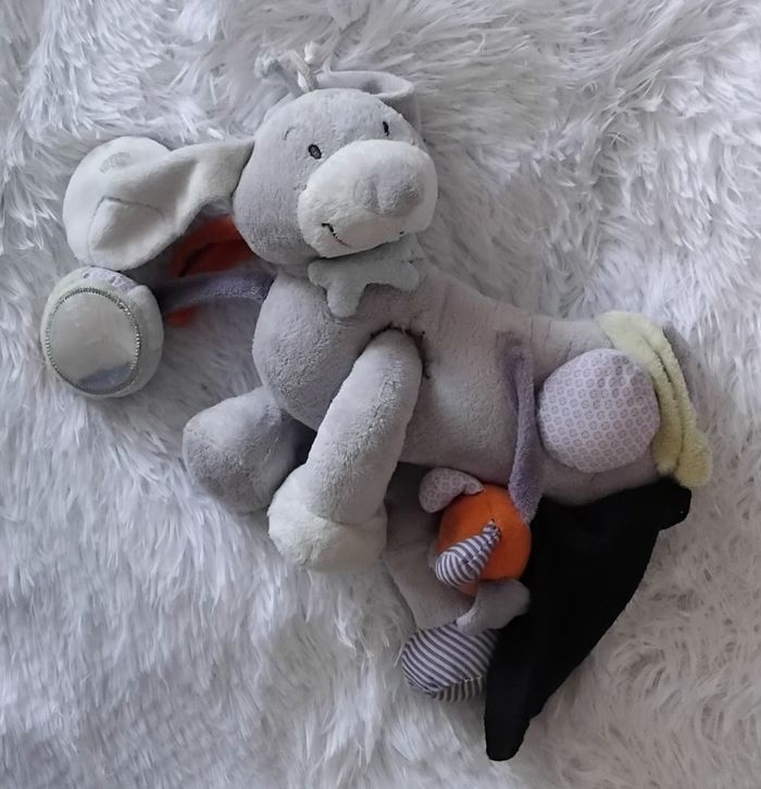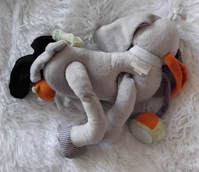 Doudou peluche chien Arthur d activités en velours de couleur gris Pieds coulissants avec bruit de grelot ,pouet pouet et bruit de papiers froissé Petit oiseau orange qui est scratcher sur le doudou Queue ,et oreilles avec bruit de papier froissé Miroir Attaché au chien